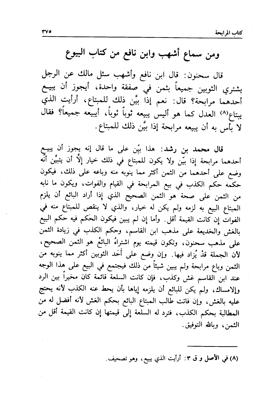 ومن سماع أشهب وابن نافع من كتاب البيوع قال سحنون: قال ابن نافع وأشهب: سئل مالك عن الرجل يشتري الثوبين جميعا بثمن في صفقة واحدة، أيجوز أن يبيع أحدهما مرابحة؟ قال: نعم إذا بين ذلك للمبتاع، أرأيت الذي يبتاع العدل كما هو أليس يبيعه ثوبا ثوبا، أيبيعه جميعا؟ فقال: لا بأس به أن يبيعه مرابحة إذا بين ذلك للمبتاع.