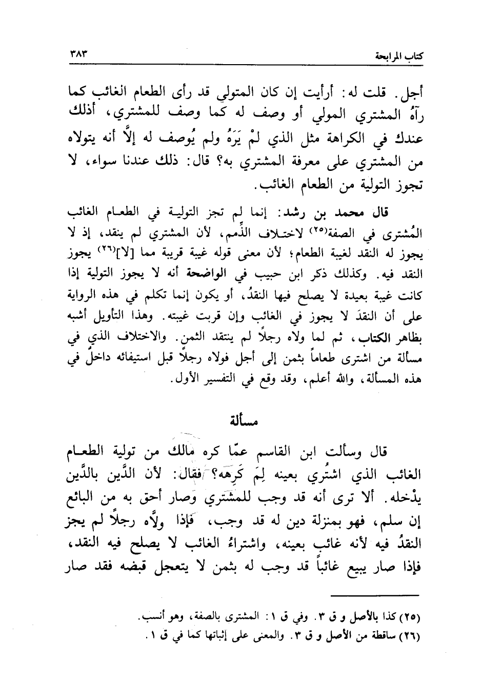 قال محمد بن رشد: إنما لم تجز التولية في الطعام الغائب المشترى في الصفة لاختلاف الذمم؛ لأن المشتري لم ينقد؛ إذ لا يجوز له النقد لغيبة الطعام؛ لأن معنى قوله غيبة قريبة مما [لا] يجوز النقد فيه.