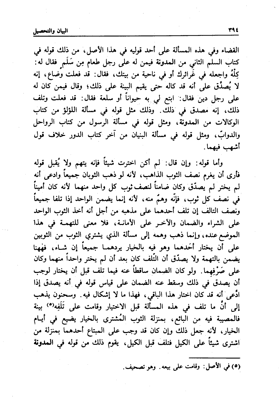 وسحنون يذهب إلى أن ما تلف في هذه المسألة قبل الاختيار، وقامت على تلفه بينة، فالمصيبة فيه من البائع، بمنزلة الثوب المشترى بالخيار يضيع في أيام الخيار؛ لأنه جعل ذلك، وإن كان قد وجب على المبتاع أحدهما بمنزلة من اشترى شيئا على الكيل، فتلف قبل الكيل، يقوم ذلك من قوله في المدونة؛