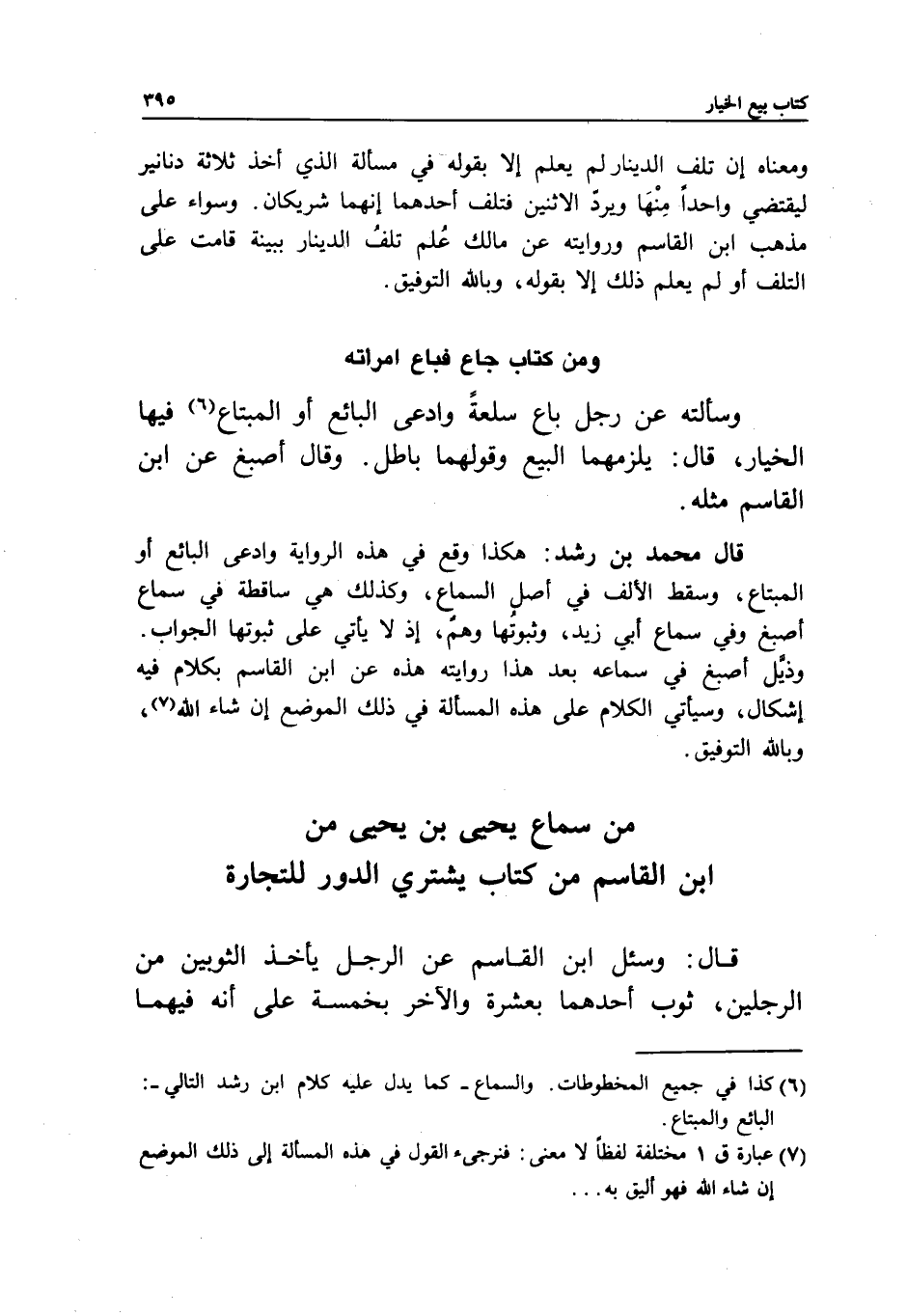 قال محمد بن رشد: هكذا وقع في هذه الرواية، وادعى البائع أو المبتاع، وسقط الألف في أصل السماع، وكذلك هي ساقطة في سماع أصبغ، وفي سماع أبي زيد، وثبوتها وهم؛ إذ لا يأتي على ثبوتها الجواب، وذيل أصبغ في سماعه بعد هذا روايته هذه، عن ابن القاسم بكلام فيه إشكال، وسيأتي الكلام على هذه المسألة في ذلك الموضع إن شاء الله، وبالله التوفيق.