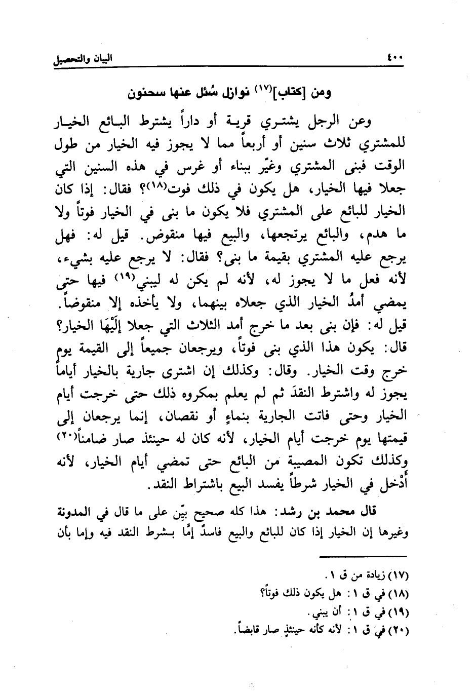 قال محمد بن رشد: هذا كله صحيح بين على ما قال في المدونة وغيرها: إن الخيار إذا كان للبائع والبيع فاسد إما بشرط النقد فيه، وإما بأن
