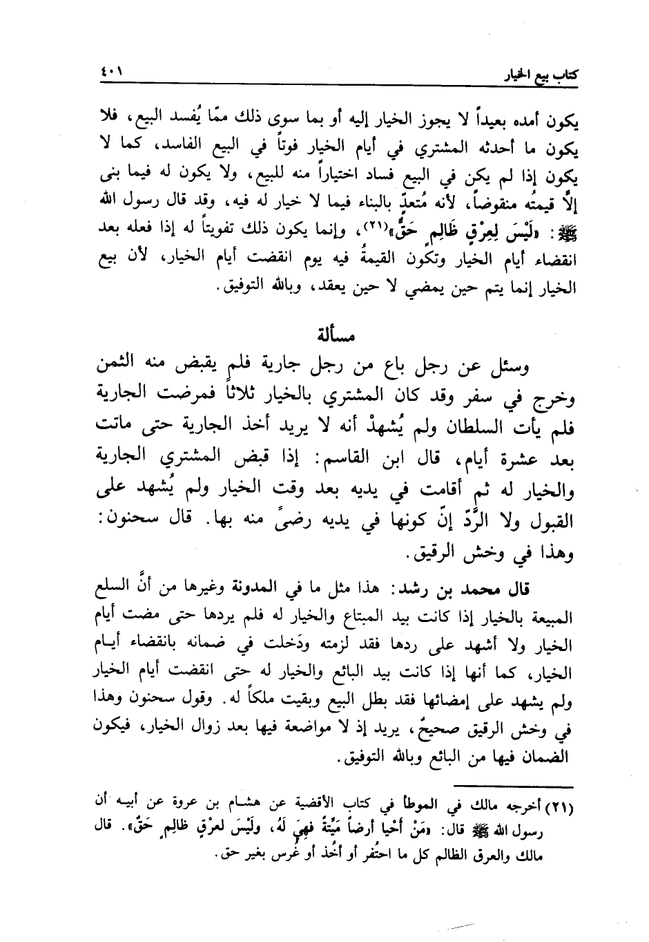 قال محمد بن رشد: هذا مثل ما في المدونة وغيرها من أن السلع المبيعة بالخيار إذا كانت بيد المبتاع والخيار له، فلم يردها حتى مضت أيام الخيار، ولا أشهد على ردها، فقد لزمته ودخلت في ضمانه بانقضاء أيام الخيار، كما أنها إذا كانت بيد البائع والخيار له حتى انقضت أيام الخيار، ولم يشهد على إمضائها، فقد بطل البيع وبقيت ملكا له، وقول سحنون: وهذا في وخش الرقيق صحيح، يريد إذ لا مواضعة فيها بعد زوال الخيار، فيكون الضمان فيها من البائع، وبالله التوفيق.