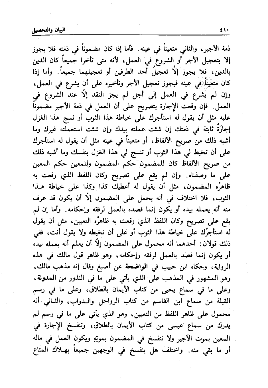 وإن لم يقع على تصريح، وكان اللفظ الذي وقعت به ظاهره المضمون، مثل أن يقول له: أعطيك كذا وكذا على خياطة هذا الثوب، فلا اختلاف في أنه يحمل على المضمون، إلا أن يكون قد عرف منه أنه يعمله بيده، أو يكون إنما قصده بالعمل لرفقه وإحكامه. وأما إن لم يقع على تصريح، وكان اللفظ الذي وقعت به ظاهره التعيين، مثل أن يقول له: أستأجرك على خياطة هذا الثوب، أو على أن تخيطه، ولا يقول: أنت، ففي ذلك قولان؛ أحدهما: أنه محمول على المضمون، إلا أن يعلم أنه يعمله بيده، أو يكون إنما قصد بالعمل لرفقه وإحكامه، وهو ظاهر قول مالك في هذه الرواية، وحكاه ابن حبيب في الواضحة، عن أصبغ، وقال: إنه مذهب مالك، وهو المشهور في المذهب على الذي يأتي على ما في النذور من المدونة، وعلى ما في سماع يحيى، من كتاب الأيمان بالطلاق، وعلى ما في رسم القبلة، من سماع ابن القاسم، من كتاب الرواحل والدواب، والثاني: أنه محمول على ظاهر اللفظ من التعيين، وهو الذي يأتي على ما في رسم لم يدرك، من سماع عيسى، من كتاب الأيمان بالطلاق.