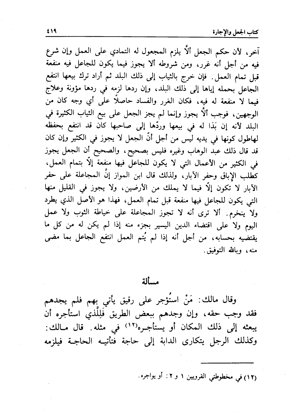 مسألة وقال مالك: من استؤجر على رقيق يأتي بهم، فلم يجدهم فقد وجب حقه، وإن وجدهم ببعض الطريق، فللذي استأجره أن يبعثه إلى ذلك المكان أو يستأجره في مثله. قال مالك: وكذلك الرجل يتكارى الدابة إلى حاجة، فتأتيه الحاجة، فيلزمه