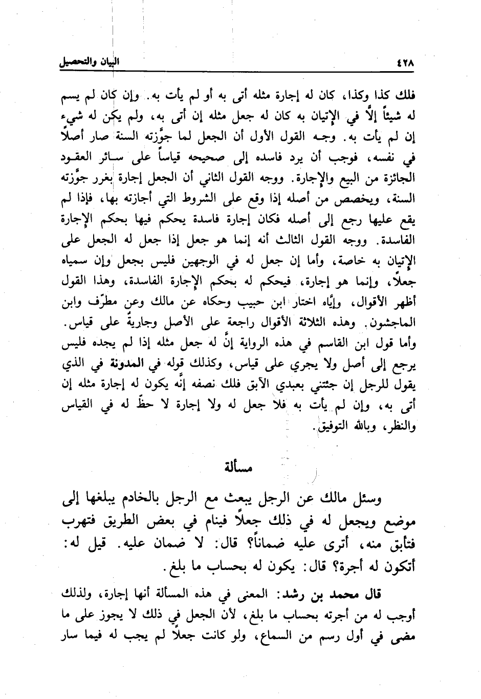 وهذه الثلاثة الأقوال راجعة على الأصل، وجارية على قياس، وأما قول ابن القاسم في هذه الرواية: إن له جعل مثله إذا لم يجده، فليس يرجع إلى أصل، ولا يجري على قياس، وكذلك قوله في المدونة في الذي يقول للرجل: إن جئتني بعبدي الأبق فلك نصفه أنه يكون له إجارة مثله إن أتى به، وإن لم يأت به، فلا جعل له ولا إجارة لا حظ له في القياس والنظر، وبالله التوفيق.
