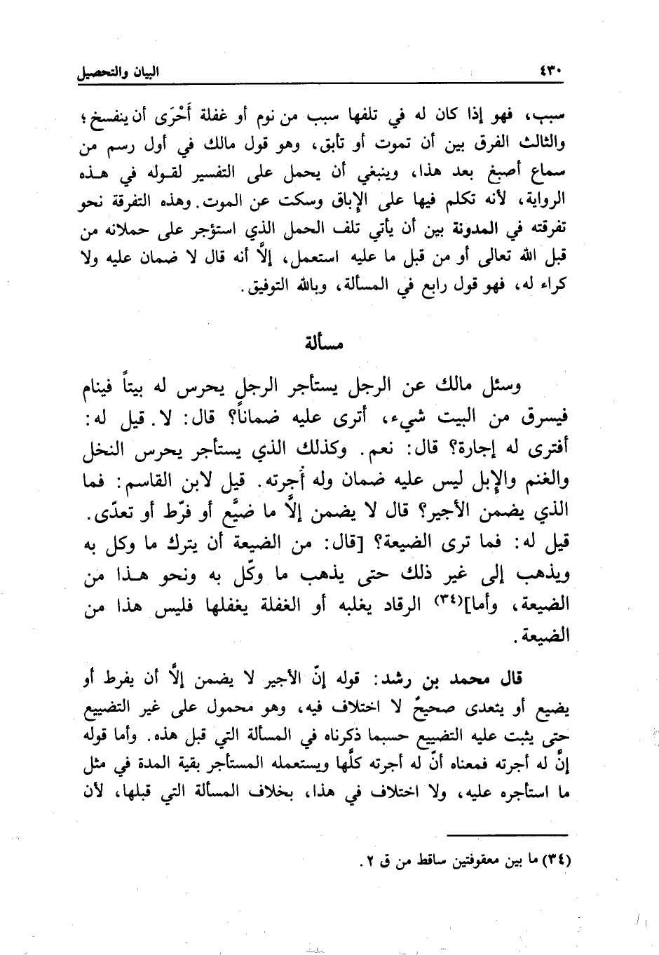 مسألة وسئل مالك عن الرجل يستأجر الرجل يحرس له بيتا، فينام فيسرق من البيت شيء، أترى عليه ضمانا؟ قال: لا. قيل له: أفترى له إجارة؟ قال: نعم. وكذلك الذي يستأجر يحرس النخل والغنم والإبل، ليس عليه ضمان وله أجرته. قيل لابن القاسم: فما الذي يضمن الأجير؟ قال: لا يضمن إلا ما ضيع أو فرط أو تعدى. قيل له: فما ترى الضيعة؟ قال: من الضيعة أن يترك ما وكل به ويذهب إلى غير ذلك حتى يذهب ما وكل به ونحو هذا من الضيعة، وأما الرقاد يغلبه أو الغفلة يغفلها، فليس هذا من الضيعة.