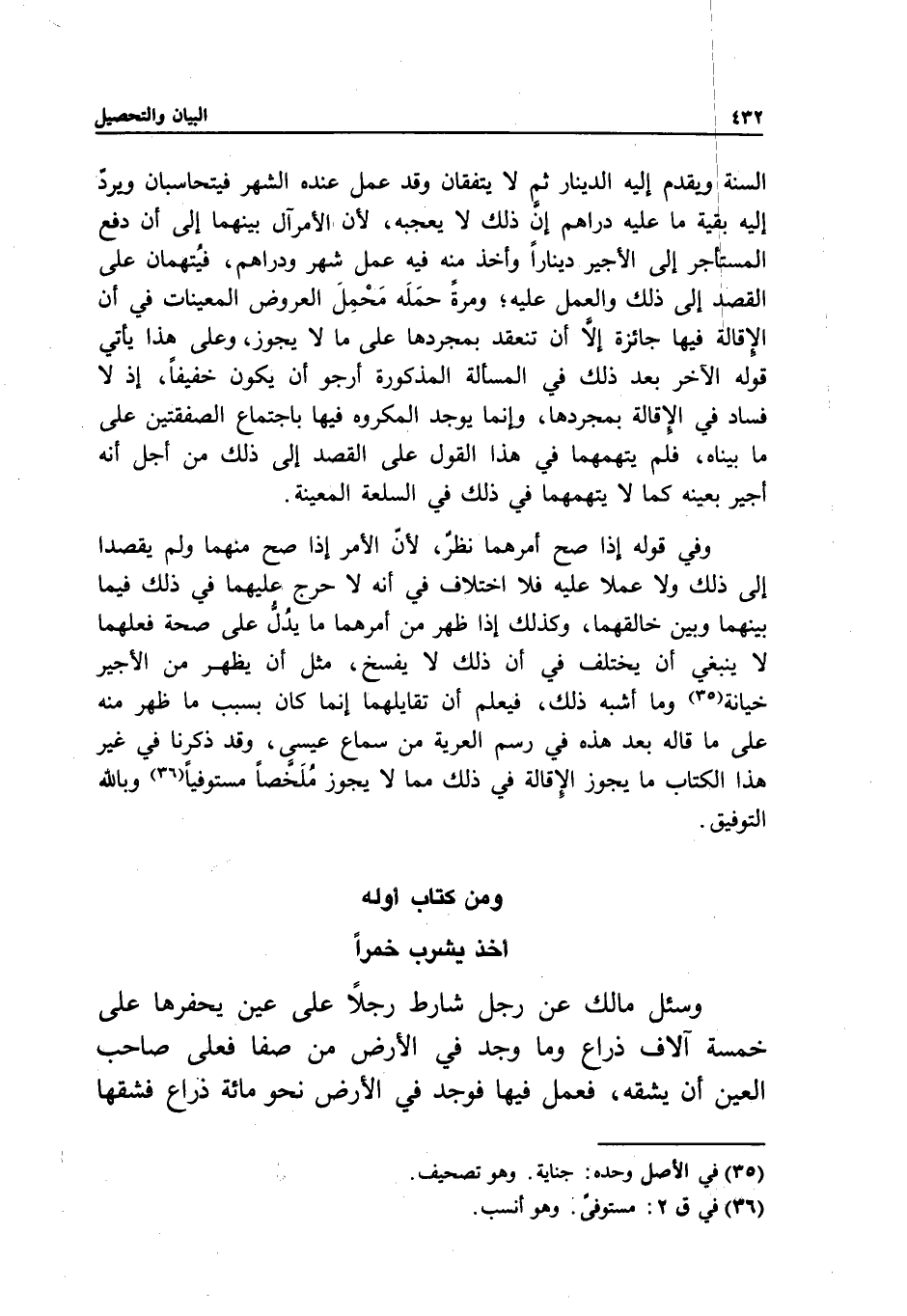 أخذ يشرب خمرا وسئل مالك عن رجل شارط رجلا على عين يحفرها على خمسة آلاف ذراع، وما وجد في الأرض من صفا، فعلى صاحب العين أن يشقه، فعمل فيها فوجد في الأرض نحو مائة ذراع فشقها