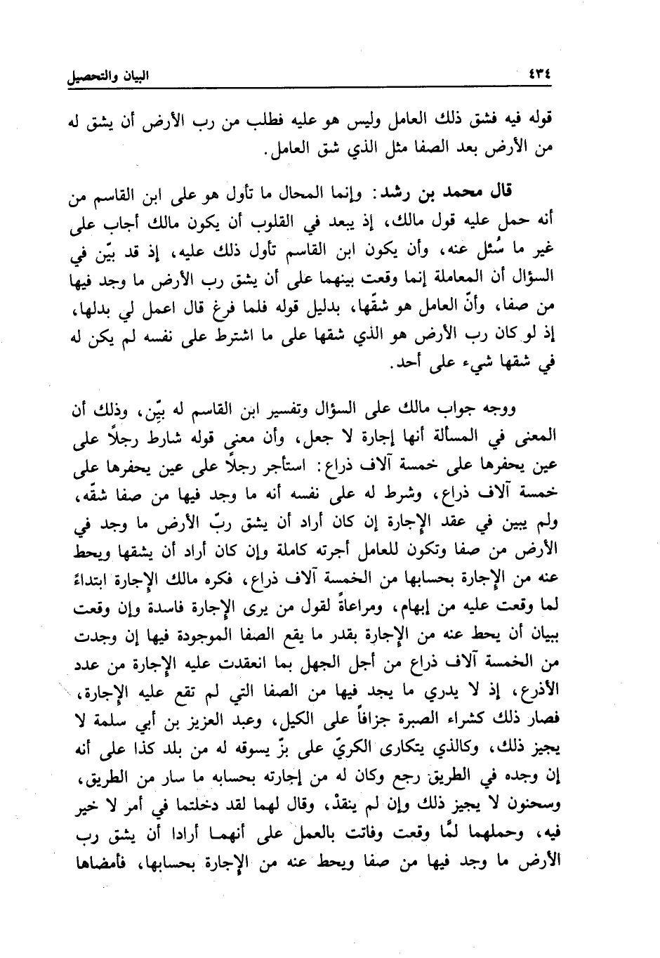 قال محمد بن رشد: وإنما المحال ما تأول هو على ابن القاسم، من أنه حمل عليه قول مالك؛ إذ يبعد في القلوب أن يكون مالك أجاب على غير ما سئل عنه، وأن يكون ابن القاسم تأول ذلك عليه، إذ قد بين في السؤال أن المعاملة إنما وقعت بينهما على أن يشق رب الأرض ما وجد فيها من صفا، وأن العامل هو شقها، بدليل قوله: فلما فرغ قال: اعمل لي بدلها؛ إذ لو كان رب الأرض هو الذي شقها على ما اشترط على نفسه، لم يكن له في شقها شيء على أحد.
