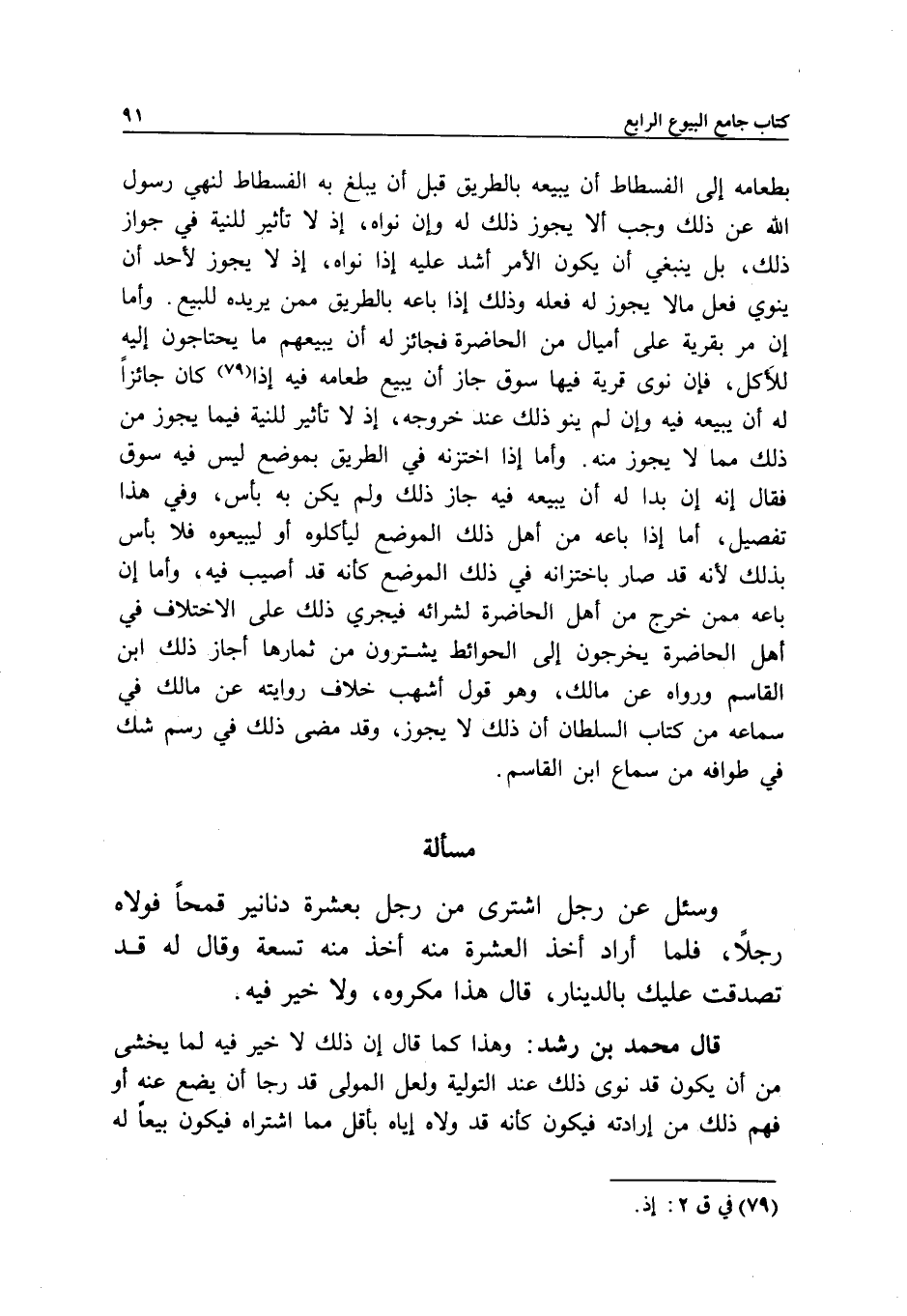 بطعامه إلى الفسطاط أن يبيعه بالطريق قبل أن يبلغ به الفسطاط لنهي رسول الله عن ذلك وجب ألا يجوز ذلك له وإن نواه، إذ لا تأثير للنية في جواز ذلك، بل ينبغي أن يكون الأمر أشد عليه إذا نواه، إذ لا يجوز لأحد أن ينوي فعل ما لا يجوز له فعله وذلك إذا باعه بالطريق ممن يريده للبيع. وأما إن مر بقرية على أميال من الحاضرة فجائز له أن يبيعهم ما يحتاجون إليه للأكل، فإن نوى قرية فيها سوق جاز أن يبيع طعامه فيه إذا كان جائزا له أن يبيعه فيه وإن لم ينو ذلك عند خروجه، إذ لا تأثير للنية فيما يجوز من ذلك مما لا يجوز منه. وأما إذا اختزنه في الطريق بموضع ليس فيه سوق فقال: إنه إن بدا له أن يبيعه فيه جاز ذلك ولم يكن به بأس، وفي هذا تفصيل، أما إذا باعه من أهل ذلك الموضع ليأكلوه أو ليبيعوه فلا بأس بذلك لأنه قد صار باختزانه في ذلك الموضع كأنه قد أصيب فيه، وأما إن باعه ممن خرج من أهل الحاضرة لشرائه فيجري ذلك محلى الاختلاف في أهل الحاضرة يخرجون إلى الحوائط يشترون من ثمارها أجاز ذلك ابن القاسم ورواه عن مالك، وهو قول أشهب خلاف روايته عن مالك في سماعه من كتاب السلطان أن ذلك لا يجوز، وقد مضى ذلك في رسم شك في طوافه من سماع ابن القاسم.