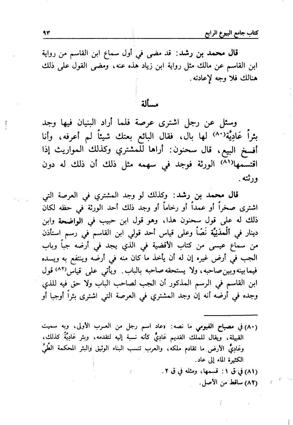 مسألة وسئل عن رجل اشترى عرصة فلما أراد البنيان فيها وجد بئرا عادية لها بال، فقال البائع: بعتك شيئا لم أعرفه، وأنا أفسخ البيع، قال سحنون: أراها للمشتري وكذلك المواريث إذا اقتسمها الورثة فوجد في سهمه مثل ذلك أن ذلك له دون ورثته.