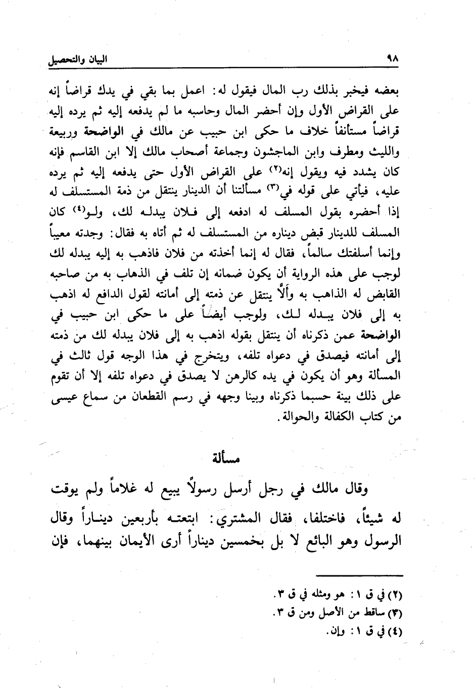 بعضه فيخبر بذلك رب المال فيقول له: اعمل بما بقي في يدك قراضا إنه على القراض الأول وإن أحضر المال وحاسبه ما لم يدفعه إليه ثم يرده إليه قراضا مستأنفا خلاف ما حكى ابن حبيب عن مالك في الواضحة وربيعة والليث ومطرف وابن الماجشون وجماعة أصحاب مالك إلا ابن القاسم فإنه كان يشدد فيه ويقول: إنه على القراض الأول حتى يدفعه إليه ثم يرده عليه، فيأتي على قوله في مسألتنا أن الدينار ينتقل من ذمة المستسلف إذا أحضره بقول المسلف له ادفعه إلى فلان يبدله لك، ولو كان المسلف للدينار قبض ديناره من المستسلف له ثم أتاه به فقال: وجدته معيبا وإنما أسلفتك سالما، فقال له: إنما أخذته من فلان فاذهب به إليه يبدله لك لوجب على هذه الرواية أن يكون ضمانه إن تلف في الذهاب به من صاحبه القابض له الذاهب به وألا ينتقل عن ذمته إلى أمانته لقول الدافع له: اذهب به إلى فلان يبدله لك، ولوجب أيضا على ما حكى ابن حبيب في الواضحة عمن ذكرناه أن ينتقل بقوله: اذهب به إلى فلان يبدله لك من ذمته إلى أمانته فيصدق في دعواه تلفه، ويتخرج في هذا الوجه قول ثالث في المسألة وهو أن يكون في يده كالرهن لا يصدق في دعواه تلفه إلا أن تقوم على ذلك بينة حسبما ذكرناه وبينا وجهه في رسم القطعان من سماع عيسى من كتاب الكفالة والحوالة.