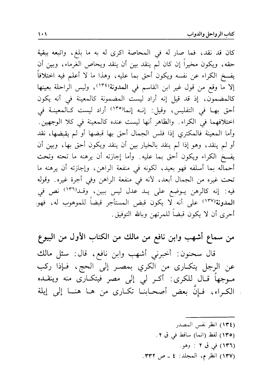 من سماع أشهب وابن نافع من مالك من الكتاب الأول من البيوع قال سحنون: أخبرني أشهب وابن نافع، قال: سئل مالك: عن الرجل يتكارى من الكري بمصر إلى الحج، فإذا ركب موجها، قال للكري: أكر لي إلى مصر، فيتكارى منه وينقده الكراء، فإن بعض أصحابنا تكارى من هاهنا إلى إيلة.