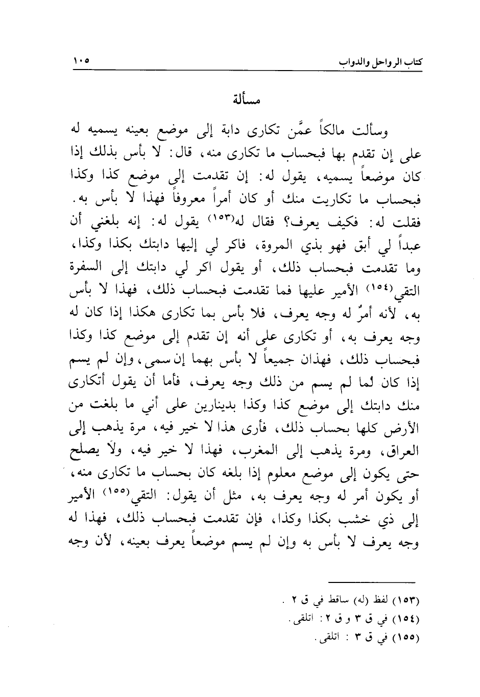 فهذان جميعا لا بأس بهما إن سمى، وإن لم يسم إذا كان لما لم يسم من ذلك وجه يعرف. فأما أن يقول: أتكارى منك دابتك إلى موضع كذا وكذا بدينارين على أني ما بلغت من الأرض كلها بحساب ذلك، فأرى هذا لا خير فيه، مرة يذهب إلى العراق، ومرة يذهب إلى المغرب، فهذا لا خير فيه، ولا يصلح حتى يكون إلى موضع معلوم إذا بلغه كان بحساب ما تكارى منه، أو يكون أمر له وجه يعرف به، مثل أن يقول: ألتقي الأمير إلى ذي خشب بكذا وكذا، فإن تقدمت فبحساب ذلك، فهذا له وجه يعرف، لا بأس به وإن لم يسم موضعا يعرف بعينه؛ لأن وجه