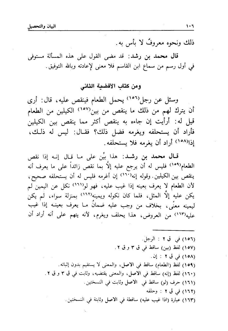 ومن كتاب الأقضية الثاني وسئل: عن رجل يحمل الطعام فينقص عليه، قال: أرى أن يترك لهم من ذلك ما ينقص من بين الكيلين من الطعام، قيل له: أرأيت إن جاءه به ينقص أكثر مما ينقص بين الكيلين فأراد أن يستحلفه ويغرمه فضل ذلك؟ فقال: ليس له ذلك، إذا أراد أن يغرمه فلا يستحلفه.
