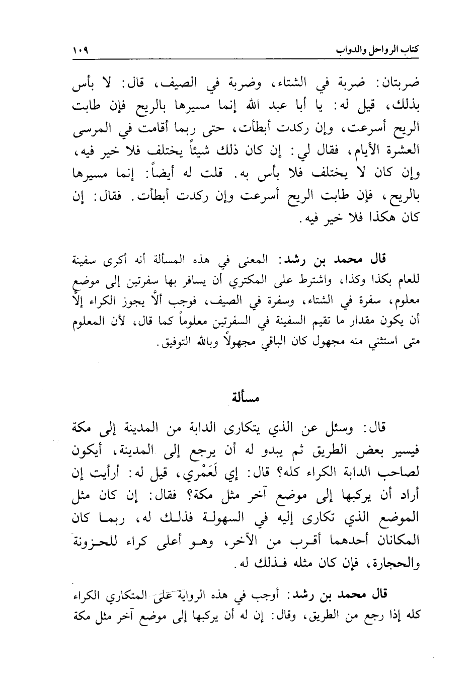 قال محمد بن رشد: المعنى في هذه المسألة أنه أكرى سفينة للعام بكذا وكذا، واشترط على المكتري أن يسافر بها سفرتين إلى موضع معلوم، سفرة في الشتاء، وسفرة في الصيف، فوجب ألا يجوز الكراء إلا أن يكون مقدار ما تقيم السفينة في السفرتين معلوما كما قال؛ لأن المعلوم متى استثني منه مجهول كان الباقي مجهولا، وبالله التوفيق.
