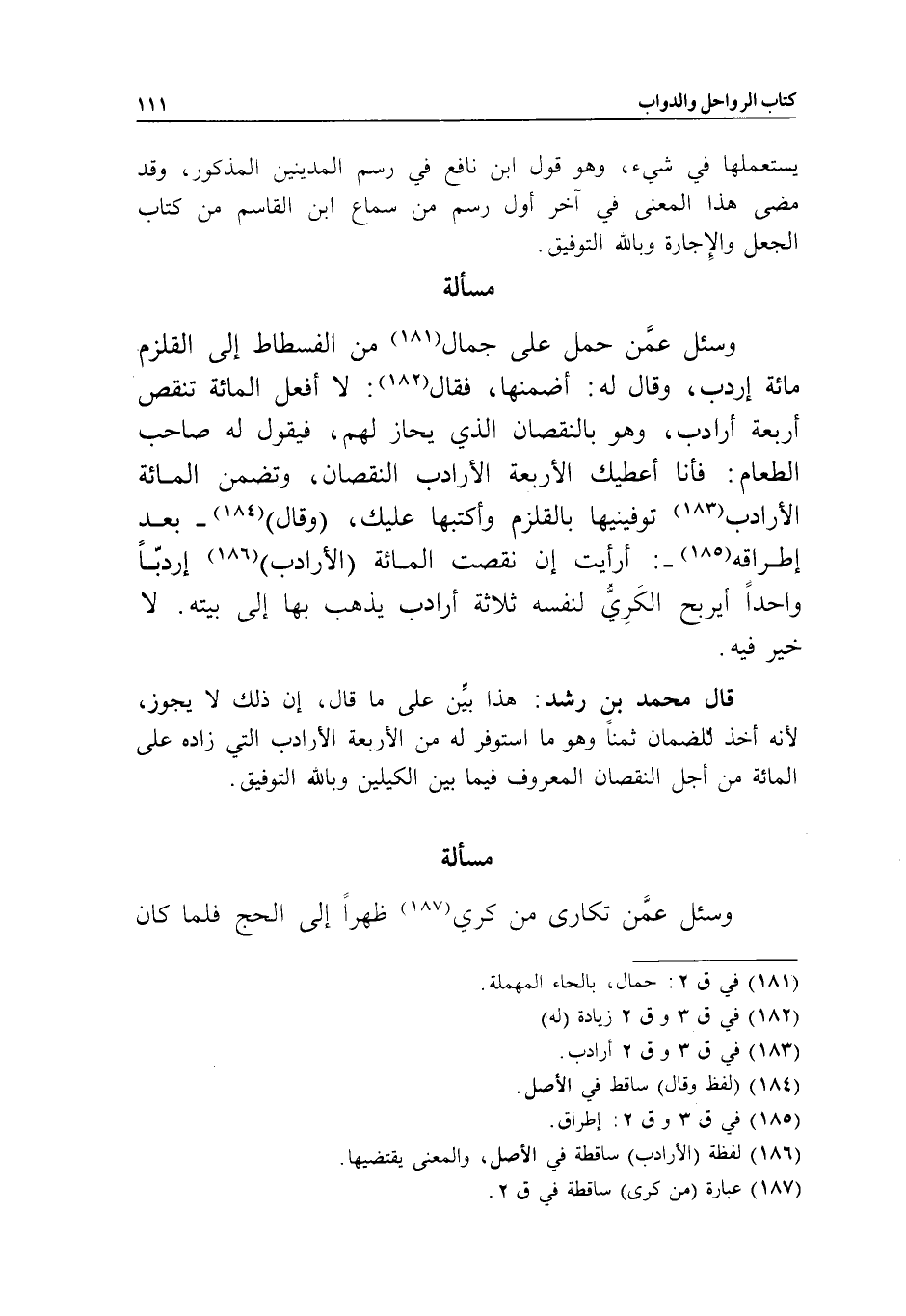 مسألة وسئل: عمن حمل على جمال من الفسطاط إلى القلزم مائة إردب، وقال له: أضمنها، فقال: لا أفعل المائة تنقص أربعة أرادب، وهو بالنقصان الذي يحاز لهم، فيقول له صاحب الطعام: فأنا أعطيك الأربعة الأرادب النقصان، وتضمن المائة الأرادب توفينيها بالقلزم وأكتبها عليك، (وقال) - بعد إطراقه -: أرأيت إن نقصت المائة (الأرادب) إردبا واحدا، أيربح الكري لنفسه ثلاثة أرادب يذهب بها إلى بيته. لا خير فيه.
