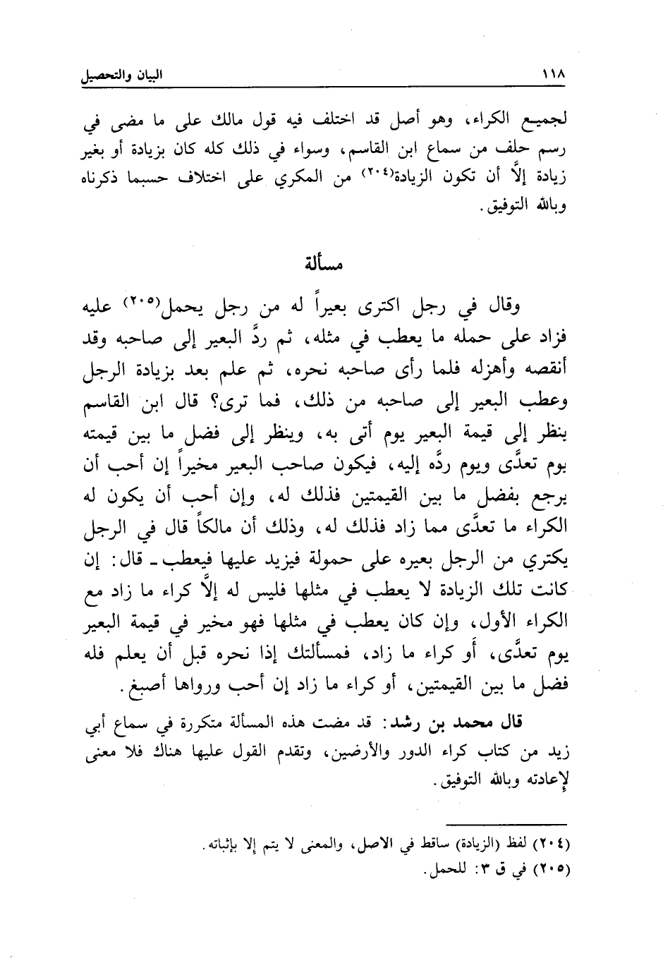 قال محمد بن رشد: قد مضت هذه المسألة متكررة في سماع أبي زيد من كتاب كراء الدور والأرضين، وتقدم القول عليها هناك فلا معنى لإعادته، وبالله التوفيق.