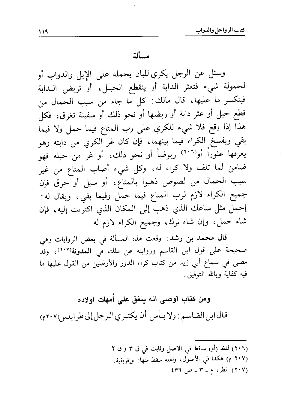 ومن كتاب أوصى أنه ينفق على أمهات أولاده قال ابن القاسم: ولا بأس أن يكتري الرجل إلى طرابلس