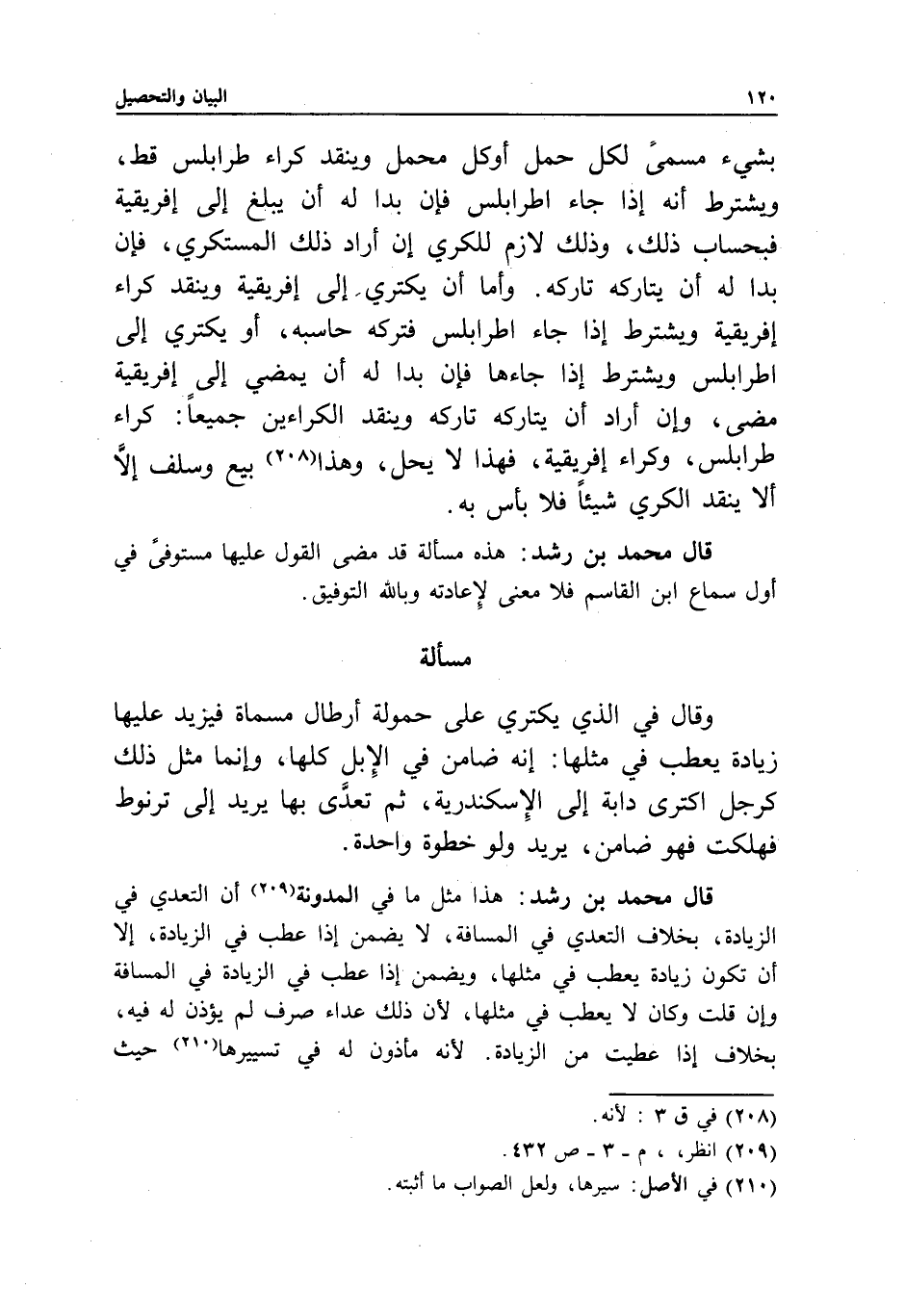 بشيء مسمى لكل حمل أو كل محمل وينقد كراء طرابلس فقط، ويشترط أنه إذا جاء طرابلس فإن بدا له أن يبلغ إلى إفريقية فبحساب ذلك، وذلك لازم للكري إن أراد ذلك المستكري، فإن بدا له أن يتاركه تاركه.