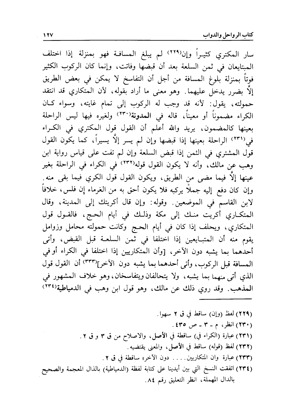 سار المكتري كثيرا وإن لم يبلغ المسافة فهو بمنزلة إذا اختلف المتبايعان في ثمن السلعة بعد أن قبضها وفاتت، وإنما كان الركوب الكثير فوتا بمنزلة بلوغ المسافة من أجل أن التفاسخ لا يمكن في بعض الطريق إلا بضرر يدخل عليهما.
