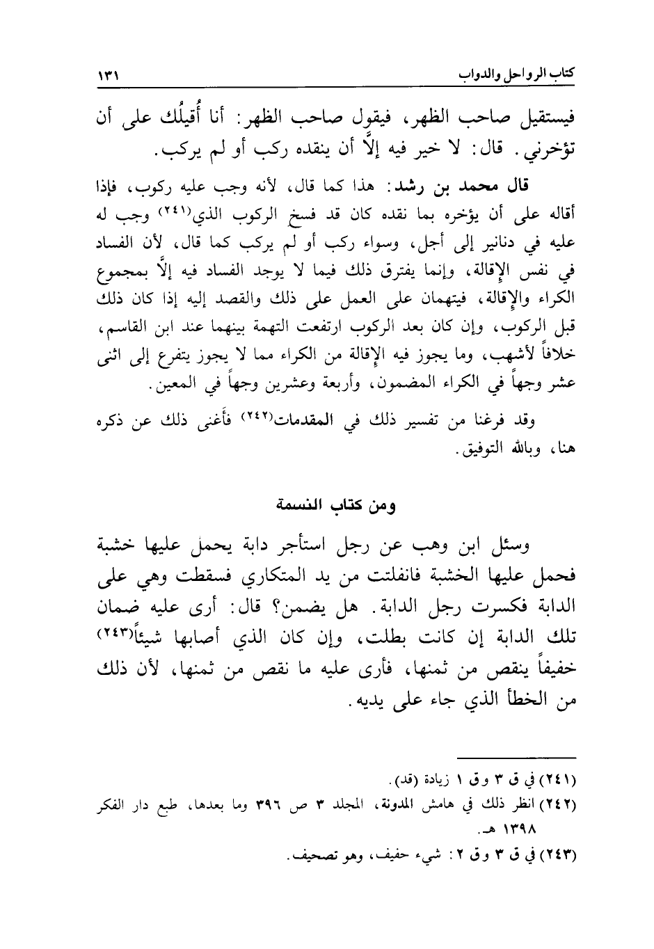 قال محمد بن رشد: هذا كما قال؛ لأنه وجب عليه ركوب، فإذا أقاله على أن يؤخره بما نقده كان قد فسخ الركوب الذي وجب له عليه في دنانير إلى أجل، وسواء ركب أو لم يركب كما قال؛ لأن الفساد في نفس الإقالة، وإنما يفترق ذلك فيما لا يوجد الفساد فيه إلا بمجموع الكراء والإقالة، فيتهمان على العمل على ذلك والقصد إليه إذا كان ذلك قبل الركوب، وإن كان بعد الركوب ارتفعت التهمة بينهما عند ابن القاسم، خلافا لأشهب، وما يجوز فيه الإقالة من الكراء مما لا يجوز يتفرع إلى اثنى عشر وجها في الكراء المضمون، وأربعة وعشرين وجها في المعين.