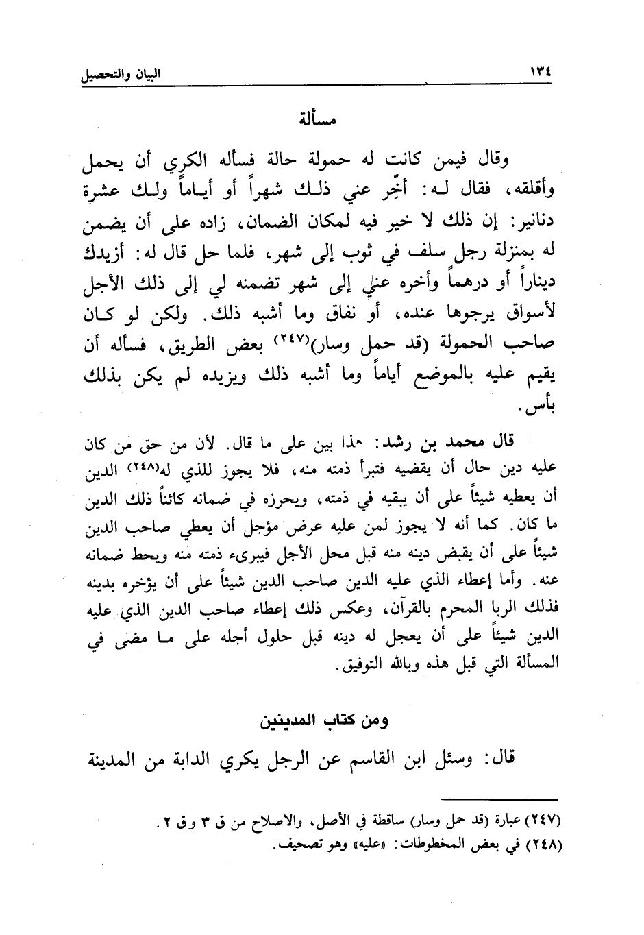 مسألة وقال فيمن كانت له حمولة حالة فسأله الكري أن يحمل وأقلقه، فقال له: أخر عني ذلك شهرا أو أياما ولك عشرة دنانير: إن ذلك لا خير فيه لمكان الضمان، زاده على أن يضمن له بمنزلة رجل سلف في ثوب إلى شهر، فلما حل قال له: أزيدك دينارا أو درهما وأخره عني إلى شهر تضمنه لي إلى ذلك الأجل لأسواق يرجوها عنده، أو نفاق وما أشبه ذلك. ولكن لو كان صاحب الحمولة (قد حمل وسار) بعض الطريق، فسأله أن يقيم عليه بالموضع أياما وما أشبه ذلك ويزيده لم يكن بذلك بأس.
