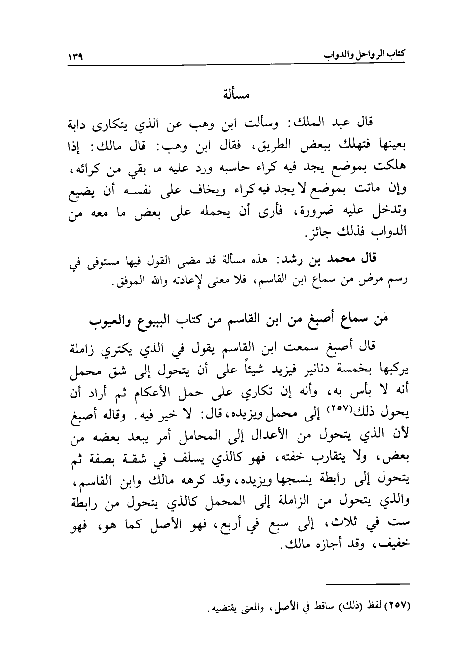 مسألة قال عبد الملك: وسألت ابن وهب عن الذي يتكارى دابة بعينها فتهلك ببعض الطريق، فقال ابن وهب: قال مالك: إذا هلكت بموضع يجد فيه كراء حاسبه ورد عليه ما بقي من كرائه، وإن ماتت بموضع لا يجد فيه كراء ويخاف على نفسه أن يضيع وتدخل عليه ضرورة، فأرى أن يحمله على بعض ما معه من الدواب فذلك جائز.