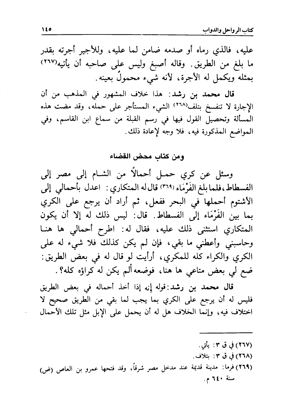 وسئل عن كري حمل أحمالا من الشام إلى مصر إلى الفسطاط، فلما بلغ الفرماء قال له المتكاري: اعدل بأحمالي إلى الأشتوم أحملها في البحر ففعل، ثم أراد أن يرجع على الكري بما بين الفرماء إلى الفسطاط. قال: ليس ذلك له إلا أن يكون المتكاري استثنى ذلك عليه، فقال له: اطرح أحمالي هاهنا وحاسبني وأعطني ما بقي، فإن لم يكن كذلك فلا شيء له على الكري والكراء كله للمكري، أرأيت لو قال له في بعض الطريق: ضع لي بعض متاعي هاهنا، فوضعه ألم يكن له كراؤه كله؟ .