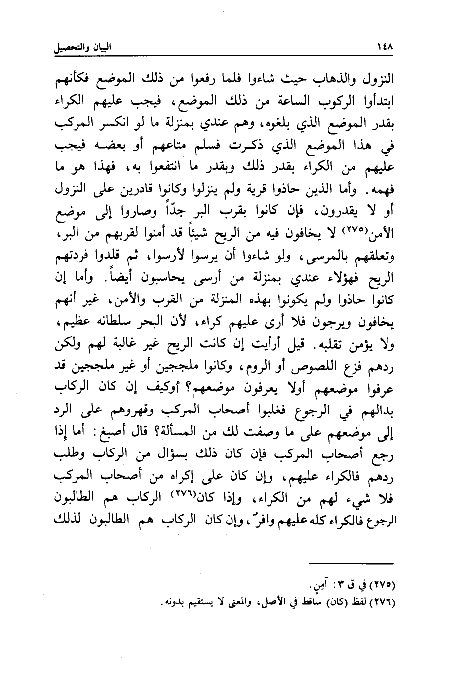 النزول والذهاب حيث شاءوا فلما رفعوا من ذلك الموضع فكأنهم ابتدأوا الركوب الساعة من ذلك الموضع، فيجب عليهم الكراء بقدر الموضع الذي بلغوه، وهم عندي بمنزلة ما لو انكسر المركب في هذا الموضع الذي ذكرت فسلم متاعهم أو بعضه فيجب عليهم من الكراء بقدر ذلك وبقدر ما انتفعوا به، فهذا هو ما فهمه. وأما الذين حاذوا قرية ولم ينزلوا وكانوا قادرين على النزول أو لا يقدرون، فإن كانوا بقرب البر جدا وصاروا إلى موضع الأمن لا يخافون فيه من الريح شيئا قد أمنوا لقربهم من البر، وتعلقهم بالمرسى، ولو شاءوا أن يرسوا لأرسوا، ثم قلدوا فردتهم الريح فهؤلاء عندي بمنزلة من أرسى يحاسبون أيضا. وأما إن كانوا حاذوا ولم يكونوا بهذه المنزلة من القرب والأمن، غير أنهم يخافون ويرجون فلا أرى عليهم كراء؛ لأن البحر سلطانه عظيم، ولا يؤمن تقلبه. قيل: أرأيت إن كانت الريح غير غالبة لهم ولكن ردهم فزع اللصوص أو الروم، وكانوا ملججين أو غير ملججين قد عرفوا موضعهم أو لا يعرفون موضعهم؟ أو كيف إن كان الركاب بدالهم في الرجوع فغلبوا أصحاب المركب وقهروهم على الرد إلى موضعهم على ما وصفت لك من المسألة؟ قال أصبغ: أما إذا رجع أصحاب المركب فإن كان ذلك بسؤال من الركاب وطلب ردهم فالكراء عليهم، وإن كان على إكراه من أصحاب المركب فلا شيء لهم من الكراء، وإذا كان الركاب هم الطالبون الرجوع فالكراء كله عليهم وافر، وإن كان الركاب هم الطالبون لذلك