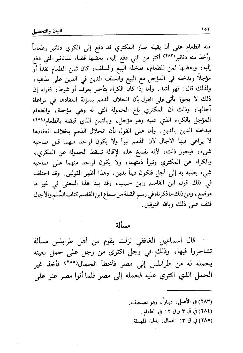 مسألة قال إسماعيل الغافقي: نزلت بقوم من أهل طرابلس مسألة تشاجروا فيها، وذلك في رجل اكترى من رجل على حمل بعينه يحمله له من طرابلس إلى مصر فأخطأ الجمال فأخذ غير الحمل الذي اكتري عليه فحمله إلى مصر فلما أتوا مصر عثر على