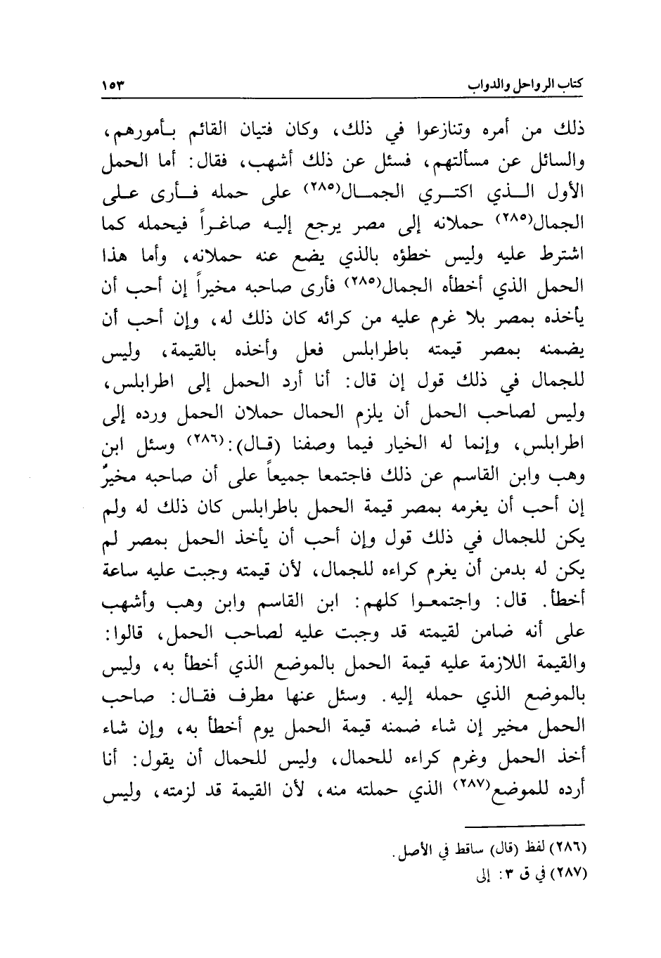ذلك من أمره وتنازعوا في ذلك، وكان فتيان القائم بأمورهم، والسائل عن مسألتهم، فسئل عن ذلك أشهب، فقال: أما الحمل الأول الذي اكتري الجمال على حمله فأرى على الجمال حملانه إلى مصر يرجع إليه صاغرا فيحمله كما اشترط عليه وليس خطؤه بالذي يضع عنه حملانه، وأما هذا الحمل الذي أخطأه الجمال فأرى صاحبه مخيرا إن أحب أن يأخذه بمصر بلا غرم عليه من كرائه كان ذلك له، وإن أحب أن يضمنه بمصر قيمته بطرابلس فعل وأخذه بالقيمة، وليس للجمال في ذلك قول إن قال: أنا أرد الحمل إلى طرابلس، وليس لصاحب الحمل أن يلزم الحمال حملان الحمل ورده إلى اطرابلس، وإنما له الخيار فيما وصفنا (قال) : وسئل ابن وهب وابن القاسم عن ذلك فاجتمعا جميعا على أن صاحبه مخير إن أحب أن يغرمه بمصر قيمة الحمل باطرابلس كان ذلك له ولم يكن للجمال في ذلك قول، وإن أحب أن يأخذ الحمل بمصر لم يكن له بد من أن يغرم كراءه للجمال؛ لأن قيمته وجبت عليه ساعة أخطأ. قال: واجتمعوا كلهم: ابن القاسم وابن وهب وأشهب على أنه ضامن لقيمته قد وجبت عليه لصاحب الحمل، قالوا: والقيمة اللازمة عليه قيمة الحمل بالموضع الذي أخطأ به، وليس بالموضع الذي حمله إليه. وسئل عنها مطرف فقال: صاحب الحمل مخير إن شاء ضمنه قيمة الحمل يوم أخطأ به، وإن شاء أخذ الحمل وغرم كراءه للحمال، وليس للحمال أن يقول: أنا أرده للموضع الذي حملته منه؛ لأن القيمة قد لزمته، وليس