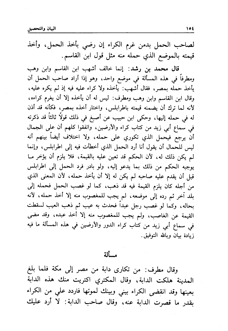 مسألة وقال مطرف: من تكارى دابة من مصر إلى مكة فلما بلغ المدينة هلكت الدابة، وقال المكتري: اكتريت منك هذه الدابة بعينها وقد انقضى الكراء بيني وبينك لموتها فاردد علي من الكراء بقدر ما قصرت الدابة عنه، وقال صاحب الدابة: لا أرد عليك