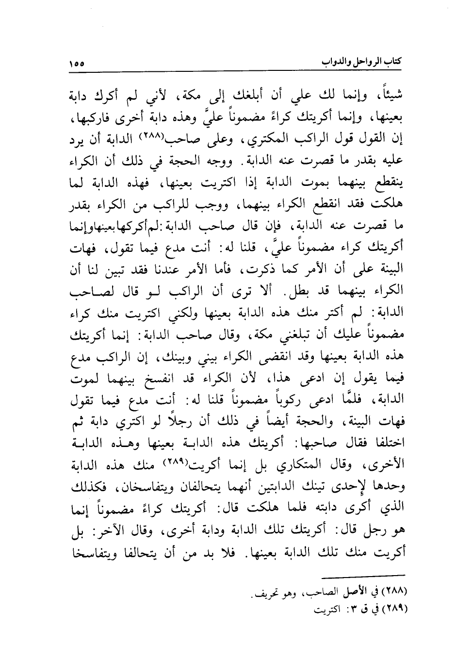 شيئا، وإنما لك علي أن أبلغك إلى مكة؛ لأني لم أكرك دابة بعينها، وإنما أكريتك كراء مضمونا علي وهذه دابة أخرى فاركبها، إن القول قول الراكب المكتري، وعلى صاحب الدابة أن يرد عليه بقدر ما قصرت عنه الدابة. ووجه الحجة في ذلك أن الكراء ينقطع بينهما بموت الدابة إذا اكتريت بعينها، فهذه الدابة لما هلكت فقد انقطع الكراء بينهما، ووجب للراكب من الكراء بقدر ما قصرت عنه الدابة، فإن قال صاحب الدابة: لم أكركها بعينها وإنما أكريتك كراء مضمونا علي، قلنا له: أنت مدع فيما تقول، فهات البينة على أن الأمر كما ذكرت، فأما الأمر عندنا فقد تبين لنا أن الكراء بينهما قد بطل. ألا ترى أن الراكب لو قال لصاحب الدابة: لم أكتر منك هذه الدابة بعينها ولكني أكتريت منك كراء مضمونا عليك أن تبلغني مكة، وقال صاحب الدابة: إنما أكريتك هذه الدابة بعينها وقد انقضى الكراء بيني وبينك، إن الراكب مدع فيما يقول إن ادعى هذا؛ لأن الكراء قد انفسخ بينهما لموت الدابة، فلما ادعى ركوبا مضمونا قلنا له: أنت مدع فيما تقول فهات البينة، والحجة أيضا في ذلك أن رجلا لو اكتري دابة ثم اختلفا فقال صاحبها: أكريتك هذه الدابة بعينها وهذه الدابة الأخرى، وقال المتكاري: بل إنما أكريت منك هذه الدابة وحدها لإحدى تينك الدابتين أنهما يتحالفان ويتفاسخان، فكذلك الذي أكرى دابته فلما هلكت قال: أكريتك كراء مضمونا إنما هو رجل قال: أكريتك تلك الدابة ودابة أخرى، وقال الآخر: بل أكريت منك تلك الدابة بعينها. فلا بد من أن يتحالفا ويتفاسخا