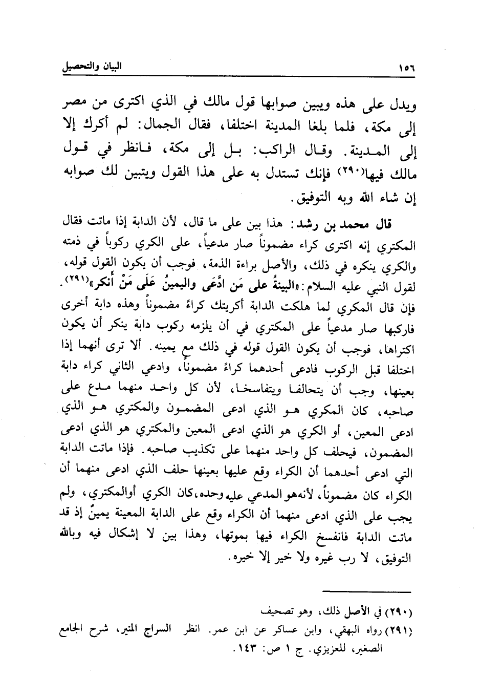 ويدل على هذه ويبين صوابها قول مالك في الذي اكترى من مصر إلى مكة، فلما بلغا المدينة اختلفا، فقال الجمال: لم أكرك إلا إلى المدينة. وقال الراكب: بل إلى مكة، فانظر في قول مالك فيها فإنك تستدل به على هذا القول ويتبين لك صوابه إن شاء الله وبه التوفيق.