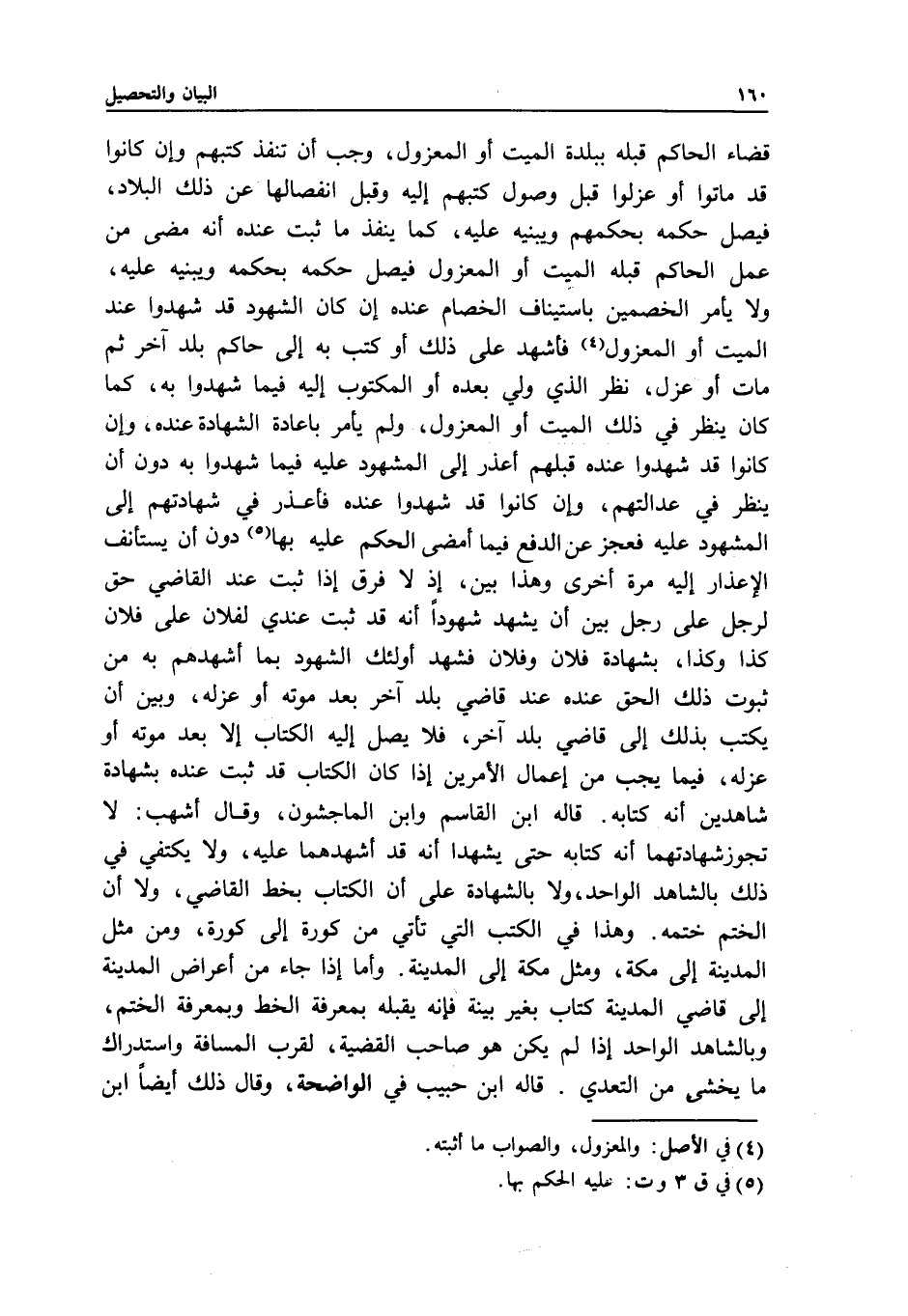 قضاء الحاكم قبله ببلدة الميت أو المعزول، وجب أن تنفذ كتبهم وإن كانوا قد ماتوا أو عزلوا قبل وصول كتبهم إليه وقبل انفصالها عن ذلك البلاد، فيصل حكمه بحكمهم ويبنيه عليه، كما ينفذ ما ثبت عنده أنه مضى من عمل الحاكم قبله الميت أو المعزول فيصل حكمه بحكمه ويبنيه عليه، ولا يأمر الخصمين باستيناف الخصام عنده إن كان الشهود قد شهدوا عند الميت أو المعزول فأشهد على ذلك أو كتب به إلى حاكم بلد آخر ثم مات أو عزل، نظر الذي ولي بعده أو المكتوب إليه فيما شهدوا به، كما كان ينظر في ذلك الميت أو المعزول، ولم يأمر بإعادة الشهادة عنده، وإن كانوا قد شهدوا عنده قبلهم أعذر إلى المشهود عليه فيما شهدوا به دون أن ينظر في عدالتهم، وإن كانوا قد شهدوا عنده فأعذر في شهادتهم إلى المشهود عليه فعجز عن الدفع فيما أمضى الحكم عليه بها دون أن يستأنف الإعذار إليه مرة أخرى وهذا بين، إذ لا فرق إذا ثبت عند القاضي حق لرجل على رجل بين أن يشهد شهودا أنه قد ثبت عندي لفلان على فلان كذا وكذا، بشهادة فلان وفلان فشهد أولئك الشهود بما أشهدهم به من ثبوت ذلك الحق عنده عند قاضي بلد آخر بعد موته أو عزله، وبين أن يكتب بذلك إلى قاضي بلد آخر، فلا يصل إليه الكتاب إلا بعد موته أو عزله، فيما يجب من إعمال الأمرين إذا كان الكتاب قد ثبت عنده بشهادة شاهدين أنه كتابه. قاله ابن القاسم وابن الماجشون، وقال أشهب: لا تجوز شهادتهما أنه كتابه حتى يشهدا أنه قد أشهدهما عليه، ولا يكتفي في ذلك بالشاهد الواحد، ولا بالشهادة على أن الكتاب بخط القاضي، ولا أن الختم ختمه. وهذا في الكتب التي تأتي من كورة إلى كورة، ومن مثل المدينة إلى مكة، ومثل مكة إلى المدينة. وأما إذا جاء من أعراض المدينة إلى قاضي المدينة كتاب بغير بينة فإنه يقبله بمعرفة الخط وبمعرفة الختم، وبالشاهد الواحد إذا لم يكن هو صاحب القضية، لقرب المسافة واستدراك ما يخشى من التعدي. قاله ابن حبيب في الواضحة، وقال ذلك أيضا ابن