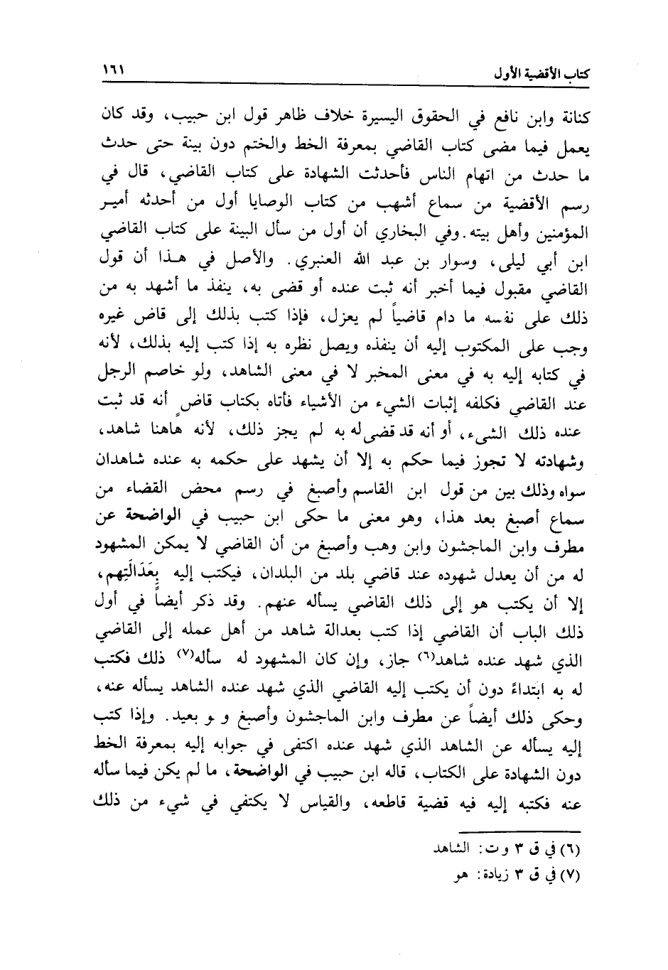 كنانة وابن نافع في الحقوق اليسيرة خلاف ظاهر قول ابن حبيب، وقد كان يعمل فيما مضى كتاب القاضي بمعرفة الخط والختم دون بينة حتى حدث ما حدث من اتهام الناس فأحدثت الشهادة على كتاب القاضي، قال في رسم الأقضية من سماع أشهب من كتاب الوصايا أول من أحدثه أمير المؤمنين وأهل بيته. وفي البخاري أن أول من سأل البينة على كتاب القاضي ابن أبي ليلى، وسوار بن عبد الله العنبري. والأصل في هذا أن قول القاضي مقبول فيما أخبر أنه ثبت عنده أو قضى به، ينفذ ما أشهد به من ذلك على نفسه ما دام قاضيا لم يعزل، فإذا كتب بذلك إلى قاض غيره وجب على المكتوب إليه أن ينفذه ويصل نظره به إذا كتب إليه بذلك؛ لأنه في كتابه إليه به في معنى المخبر لا في معنى الشاهد، ولو خاصم الرجل عند القاضي فكلفه إثبات الشيء من الأشياء فأتاه بكتاب قاض أنه قد ثبت عنده ذلك الشيء، أو أنه قد قضى له به لم يجز ذلك؛ لأنه هاهنا شاهد، وشهادته لا تجوز فيما حكم به إلا أن يشهد على حكمه به عنده شاهدان سواه وذلك بين من قول ابن القاسم وأصبغ في رسم محض القضاء من سماع أصبغ بعد هذا، وهو معنى ما حكى ابن حبيب في الواضحة عن مطرف وابن الماجشون وابن وهب وأصبغ من أن القاضي لا يمكن المشهود له من أن يعدل شهوده عند قاضي بلد من البلدان، فيكتب إليه بعدالتهم، إلا أن يكتب هو إلى ذلك القاضي يسأله عنهم. وقد ذكر أيضا في أول ذلك الباب أن القاضي إذا كتب بعدالة شاهد من أهل عمله إلى القاضي الذي شهد عنده شاهد جاز، وإن كان المشهود له سأله ذلك فكتب له به ابتداء دون أن يكتب إليه القاضي الذي شهد عنده الشاهد يسأله عنه، وحكى ذلك أيضا عن مطرف وابن الماجشون وأصبغ وهو بعيد. وإذا كتب إليه يسأله عن الشاهد الذي شهد عنده اكتفى في جوابه إليه بمعرفة الخط دون الشهادة على الكتاب، قاله ابن حبيب في الواضحة، ما لم يكن فيما سأله عنه فكتبه إليه فيه قضية قاطعة، والقياس لا يكتفي في شيء من ذلك
