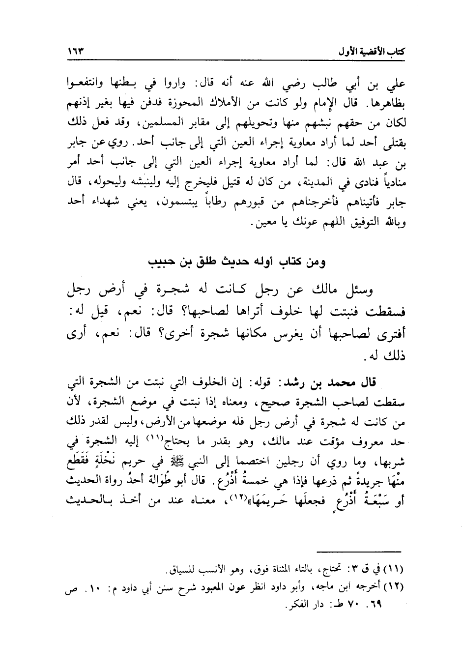 علي بن أبي طالب - رَضِيَ اللَّهُ عَنْهُ - أنه قال: واروا في بطنها وانتفعوا بظاهرها. قال الإمام: ولو كانت من الأملاك المحوزة فدفن فيها بغير إذنهم لكان من حقهم نبشهم منها وتحويلهم إلى مقابر المسلمين، وقد فعل ذلك بقتلى أحد لما أراد معاوية إجراء العين التي إلى جانب أحد. روي عن جابر بن عبد الله قال: لما أراد معاوية إجراء العين التي إلى جانب أحد أمر مناديا فنادى في المدينة، من كان له قتيل فليخرج إليه ولينبشه وليحوله، قال جابر: فأتيناهم فأخرجناهم من قبورهم رطابا يبتسمون، يعني شهداء أحد وبالله التوفيق اللهم عونك يا معين.