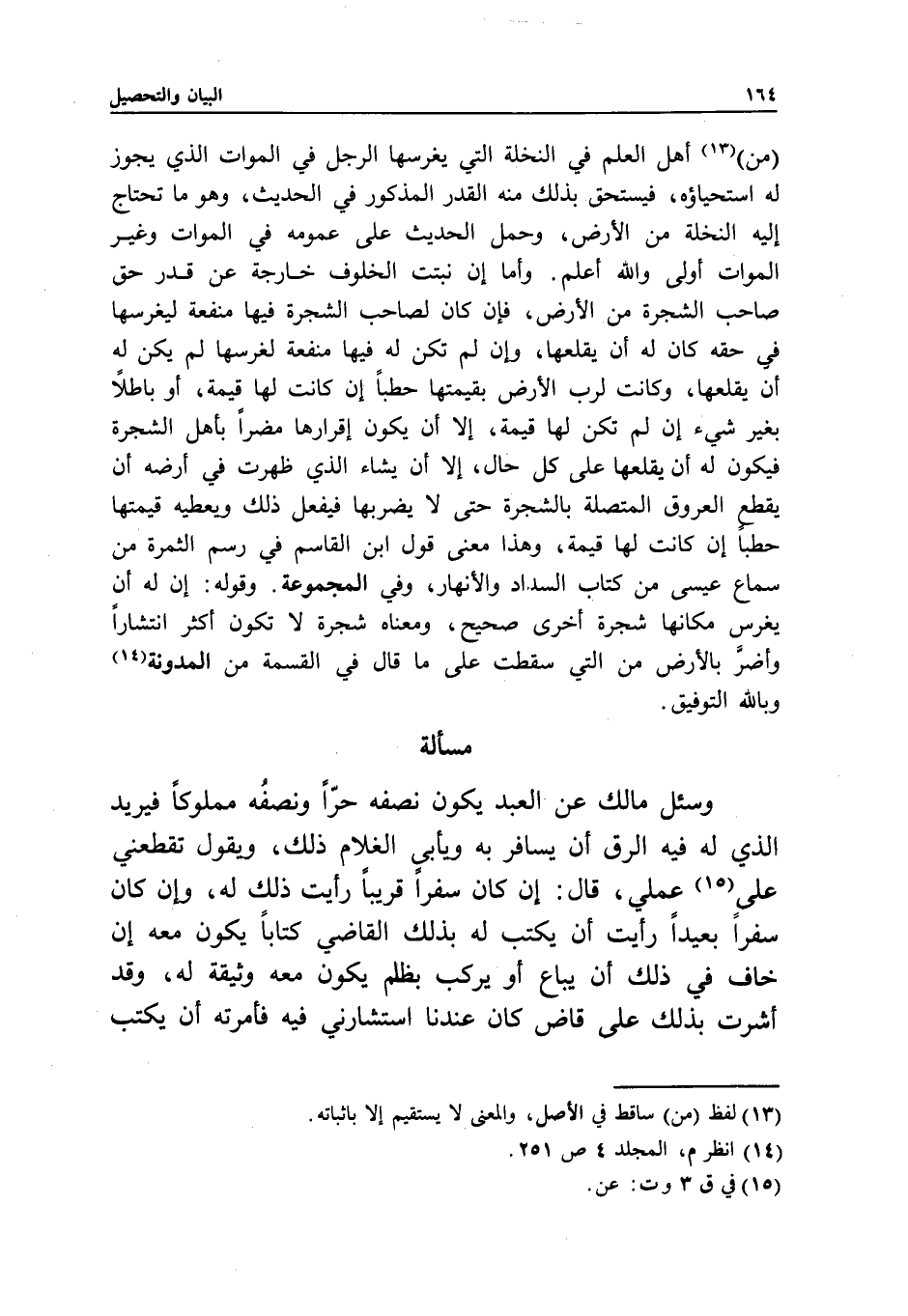 (من) أهل العلم في النخلة التي يغرسها الرجل في الموات الذي يجوز له استحياؤه، فيستحق بذلك منه القدر المذكور في الحديث، وهو ما تحتاج إليه النخلة من الأرض، وحمل الحديث على عمومه في الموات وغير الموات أولى والله أعلم. وأما إن نبت الخلوف خارجة عن قدر حق صاحب الشجرة من الأرض، فإن كان لصاحب الشجرة فيها منفعة ليغرسها في حقه كان له أن يقلعها، وإن لم تكن له فيها منفعة لغرسها لم يكن له أن يقلعها، وكانت لرب الأرض بقيمتها حطبا إن كانت لها قيمة، أو باطلا بغير شيء إن لم تكن لها قيمة، إلا أن يكون إقرارها مضرا بأهل الشجرة فيكون له أن يقلعها على كل حال، إلا أن يشاء الذي ظهرت في أرضه أن يقطع العروق المتصلة بالشجرة حتى لا يضربها فيفعل ذلك ويعطيه قيمتها حطبا إن كانت لها قيمة، وهذا معنى قول ابن القاسم في رسم الثمرة من سماع عيسى من كتاب السداد والأنهار، وفي المجموعة. وقوله: إن له أن يغرس مكانها شجرة أخرى صحيح، ومعناه شجرة لا تكون أكثر انتشارا وأضر بالأرض من التي سقطت على ما قال في القسمة من المدونة وبالله التوفيق.