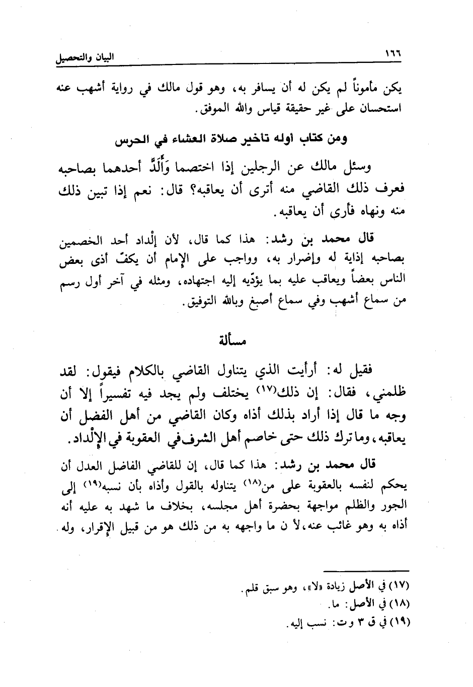 مسألة فقيل له: أرأيت الذي يتناول القاضي بالكلام فيقول: لقد ظلمني، فقال: إن ذلك يختلف ولم يجد فيه تفسيرا إلا أن وجه ما قال إذا أراد بذلك أذاه وكان القاضي من أهل الفضل أن يعاقبه، وما ترك ذلك حتى خاصم أهل الشرف في العقوبة في الإلداد.