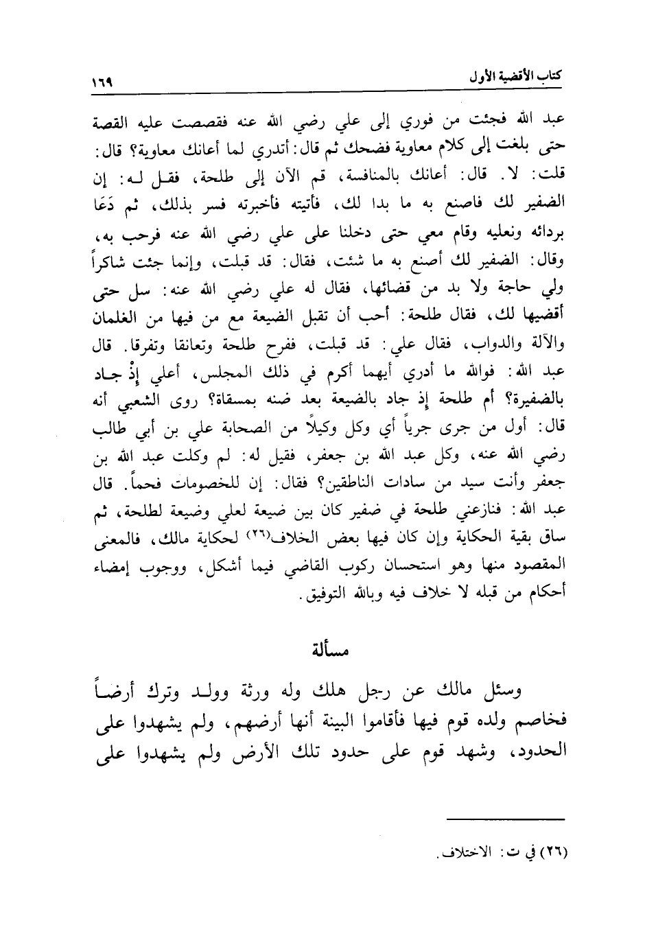 عبد الله: فجئت من فوري إلى علي - رَضِيَ اللَّهُ عَنْهُ - فقصصت عليه القصة حتى بلغت إلى كلام معاوية فضحك ثم قال: أتدري لما أعانك معاوية؟ قال: قلت: لا. قال: أعانك بالمنافسة، قم الآن إلى طلحة، فقل له: إن الضفير لك فاصنع به ما بدا لك، فأتيته فأخبرته فسر بذلك، ثم دعا بردائه ونعليه وقام معي حتى دخلنا على علي - رَضِيَ اللَّهُ عَنْهُ - فرحب به، وقال: الضفير لك أصنع به ما شئت، فقال: قد قبلت، وإنما جئت شاكرا ولي حاجة ولا بد من قضائها، فقال له علي - رَضِيَ اللَّهُ عَنْهُ -: سل حتى أقضيها لك، فقال طلحة: أحب أن تقبل الضيعة مع من فيها من الغلمان والآلة والدواب، فقال علي: قد قبلت، ففرح طلحة وتعانقا وتفرقا. قال عبد الله: فوالله ما أدري أيهما أكرم في ذلك المجلس، أعلي إذ جاد بالضفيرة؟ أم طلحة إذ جاد بالضيعة بعد ضنه بمسقاة؟ روى الشعبي أنه قال: أول من جرى جريا أي وكل وكيلا من الصحابة علي بن أبي طالب - رَضِيَ اللَّهُ عَنْهُ -، وكل عبد الله بن جعفر، فقيل له: لم وكلت عبد الله بن جعفر وأنت سيد من سادات الناطقين؟ فقال: إن للخصومات فحما. قال عبد الله: فنازعني طلحة في ضفير كان بين ضيعة لعلي وضيعة لطلحة، ثم ساق بقية الحكاية وإن كان فيها بعض الخلاف لحكاية مالك، فالمعنى المقصود منها وهو استحسان ركوب القاضي فيما أشكل، ووجوب إمضاء أحكام من قبله لا خلاف فيه وبالله التوفيق.