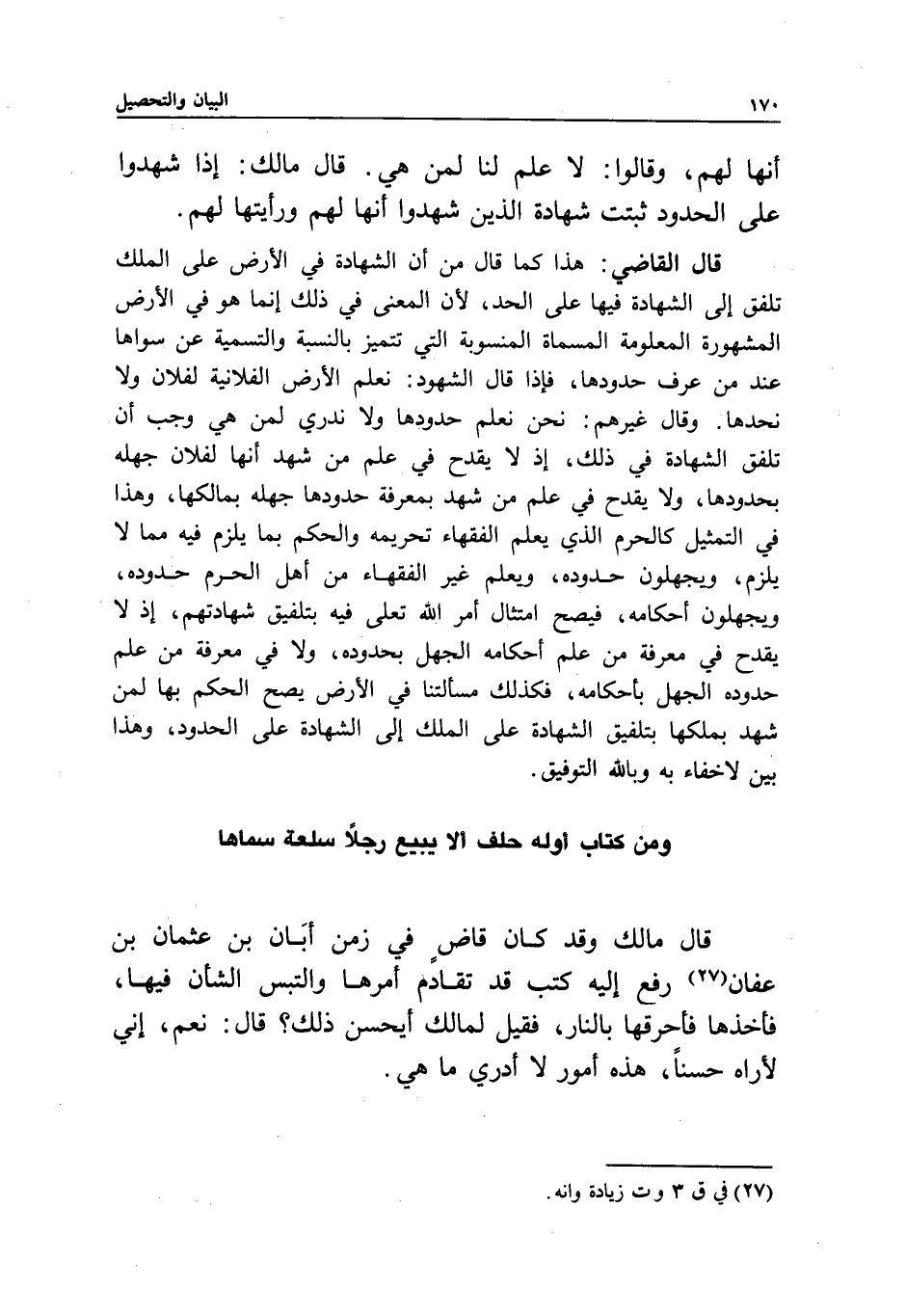 ومن كتاب أوله حلف ألا يبيع رجلا سلعة سماها قال مالك: وقد كان قاض في زمن أبان بن عثمان بن عفان رفع إليه كتب قد تقادم أمرها والتبس الشأن فيها، فأخذها فأحرقها بالنار، فقيل لمالك: أيحسن ذلك؟ قال: نعم، إني لأراه حسنا، هذه أمور لا أدري ما هي.