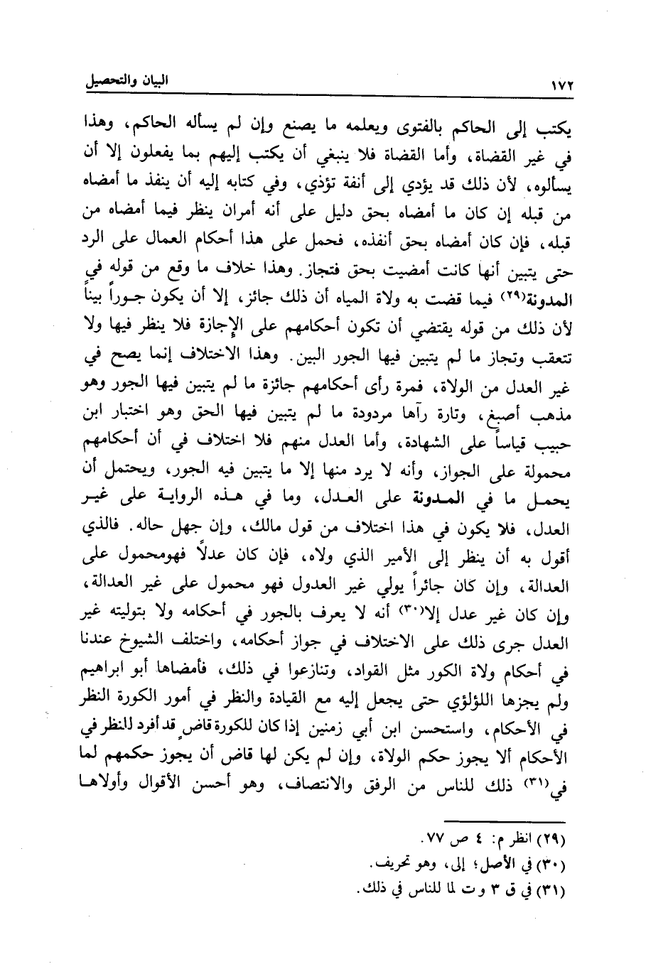يكتب إلى الحاكم بالفتوى ويعلمه ما يصنع وإن لم يسأله الحاكم، وهذا في غير القضاة، وأما القضاة فلا ينبغي أن يكتب إليهم بما يفعلون إلا أن يسألوه؛ لأن ذلك قد يؤدي إلى أنفة تؤذي، وفي كتابه إليه أن ينفذ ما أمضاه من قبله إن كان ما أمضاه بحق دليل على أنه أمران ينظر فيما أمضاه من قبله، فإن كان أمضاه بحق أنفذه، فحمل على هذا أحكام العمال على الرد حتى يتبين أنها كانت أمضيت بحق فتجاز. وهذا خلاف ما وقع من قوله في المدونة فيما قضت به ولاة المياه أن ذلك جائز، إلا أن يكون جورا بينا لأن ذلك من قوله يقتضي أن تكون أحكامهم على الإجازة فلا ينظر فيها ولا تتعقب وتجاز ما لم يتبين فيها الجور البين. وهذا الاختلاف إنما يصح في غير العدل من الولاة، فمرة رأى أحكامهم جائزة ما لم يتبين فيها الجور وهو مذهب أصبغ، وتارة رآها مردودة ما لم يتبين فيها الحق وهو اختيار ابن حبيب قياسا على الشهادة، وأما العدل منهم فلا اختلاف في أن أحكامهم محمولة على الجواز، وأنه لا يرد منها إلا ما يتبين فيه الجور، ويحتمل أن يحمل ما في المدونة على العدل، وما في هذه الرواية على غير العدل، فلا يكون في هذا اختلاف من قول مالك، وإن جهل حاله. فالذي أقول به أن ينظر إلى الأمير الذي ولاه، فإن كان عدلا فهو محمول على العدالة، وإن كان جائرا يولي غير العدول فهو محمول على غير العدالة، وإن كان غير عدل إلا أنه لا يعرف بالجور في أحكامه ولا بتوليته غير العدل جرى ذلك على الاختلاف في جواز أحكامه، واختلف الشيوخ عندنا في أحكام ولاة الكور مثل القواد، وتنازعوا في ذلك، فأمضاها أبو إبراهيم ولم يجزها اللؤلؤي حتى يجعل إليه مع القيادة والنظر في أمور الكورة النظر في الأحكام، واستحسن ابن أبي زمنين إذا كان للكورة قاض قد أفرد للنظر في الأحكام ألا يجوز حكم الولاة، وإن لم يكن لها قاض أن يجوز حكمهم لما في ذلك للناس من الرفق والانتصاف، وهو أحسن الأقوال وأولاها