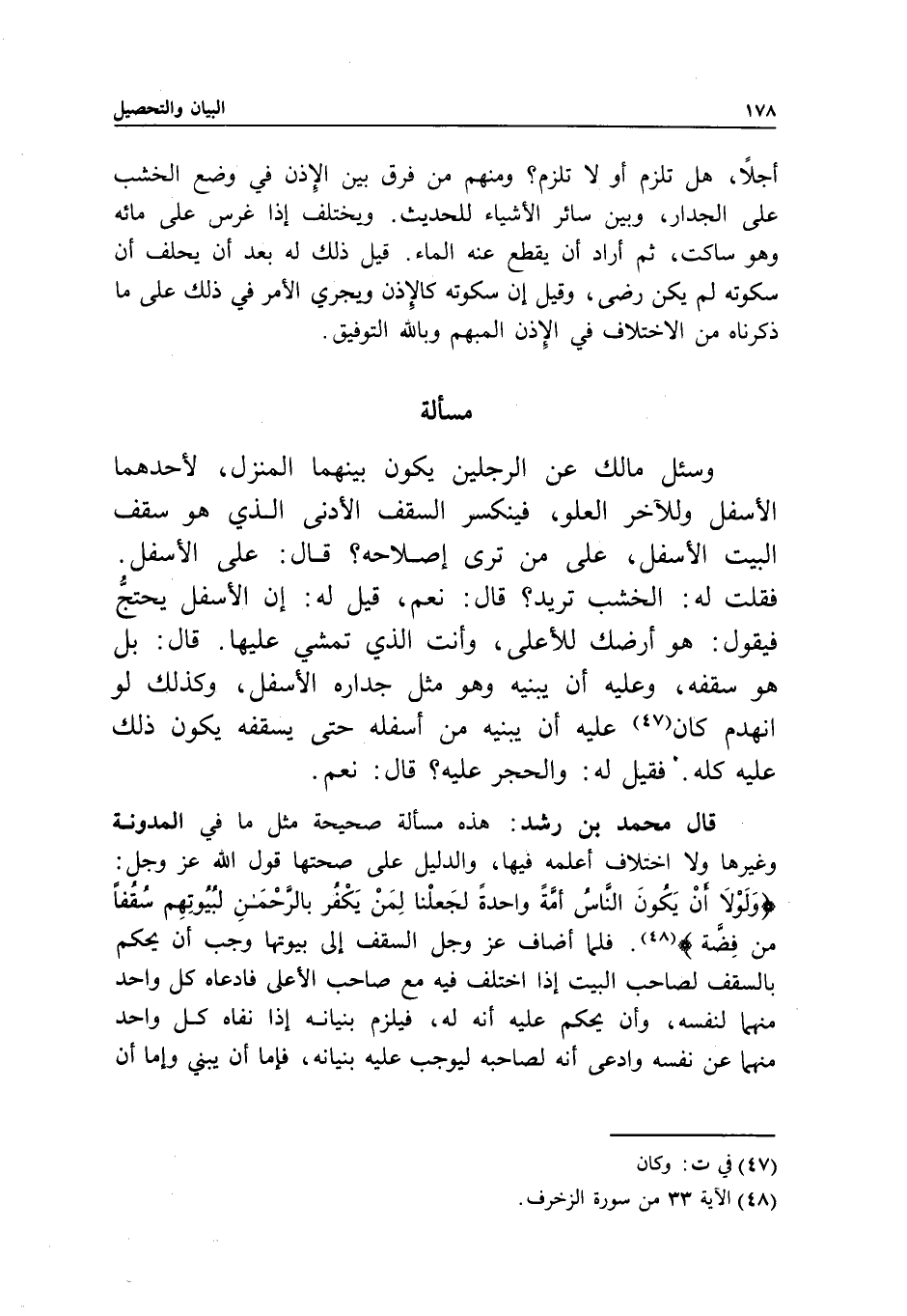 قال محمد بن رشد: هذه مسألة صحيحة مثل ما في المدونة وغيرها ولا اختلاف أعلمه فيها، والدليل على صحتها قول الله عز وجل: {وَلَوْلا أَنْ يَكُونَ النَّاسُ أُمَّةً وَاحِدَةً لَجَعَلْنَا لِمَنْ يَكْفُرُ بِالرَّحْمَنِ لِبُيُوتِهِمْ سُقُفًا مِنْ فِضَّةٍ} [الزخرف: 33] . فلما أضاف عز وجل السقف إلى بيوتها وجب أن يحكم بالسقف لصاحب البيت إذا اختلف فيه مع صاحب الأعلى فادعاه كل واحد منهما لنفسه، وأن يحكم عليه أنه له، فيلزم بنيانه إذا نفاه كل واحد منهما عن نفسه وادعى أنه لصاحبه ليوجب عليه بنيانه، فإما أن يبني وإما أن