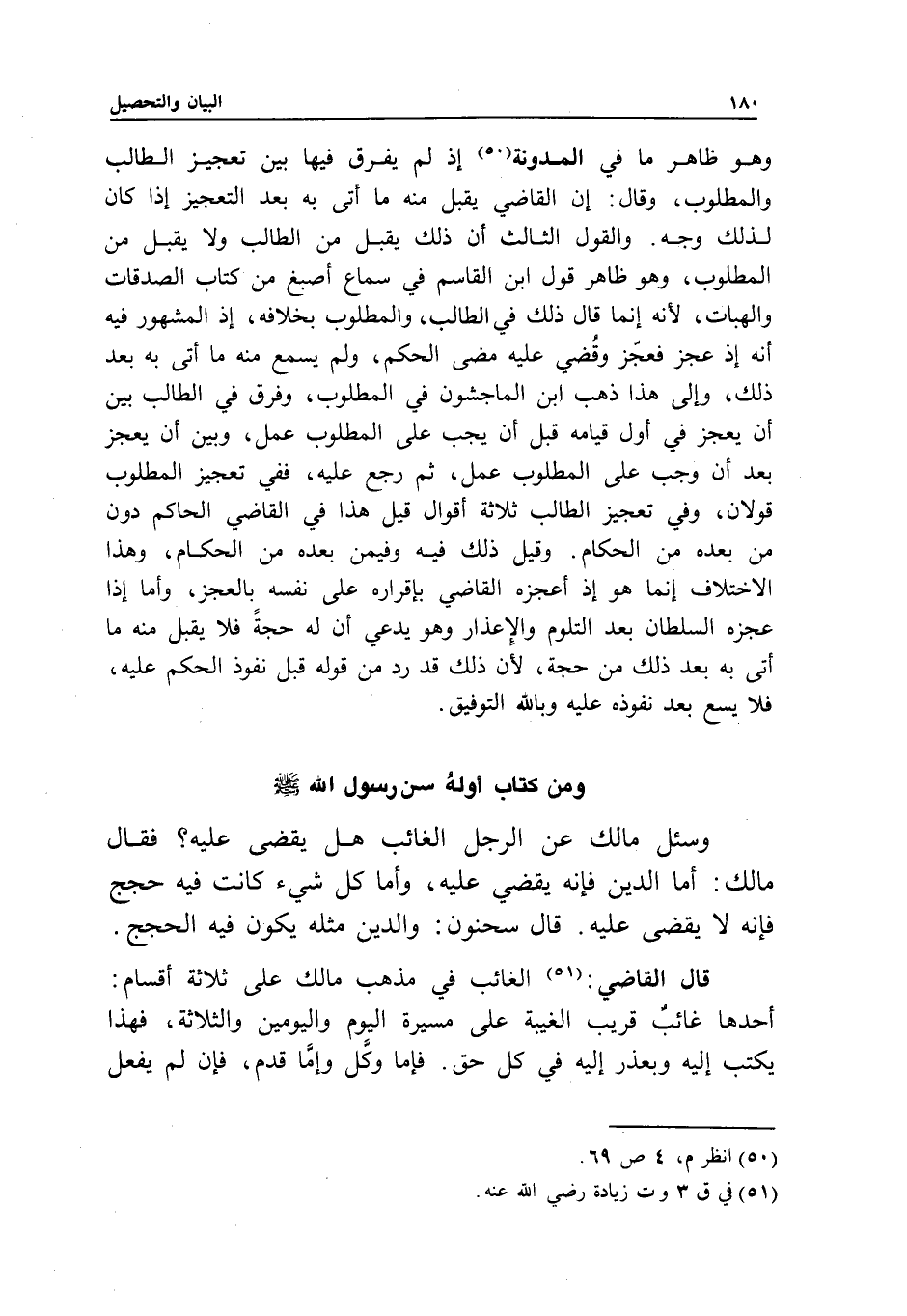 وسئل مالك عن الرجل الغائب هل يقضى عليه؟ فقال مالك: أما الدين فإنه يقضي عليه، وأما كل شيء كانت فيه حجج فإنه لا يقضى عليه. قال سحنون: والدين مثله يكون فيه الحجج.