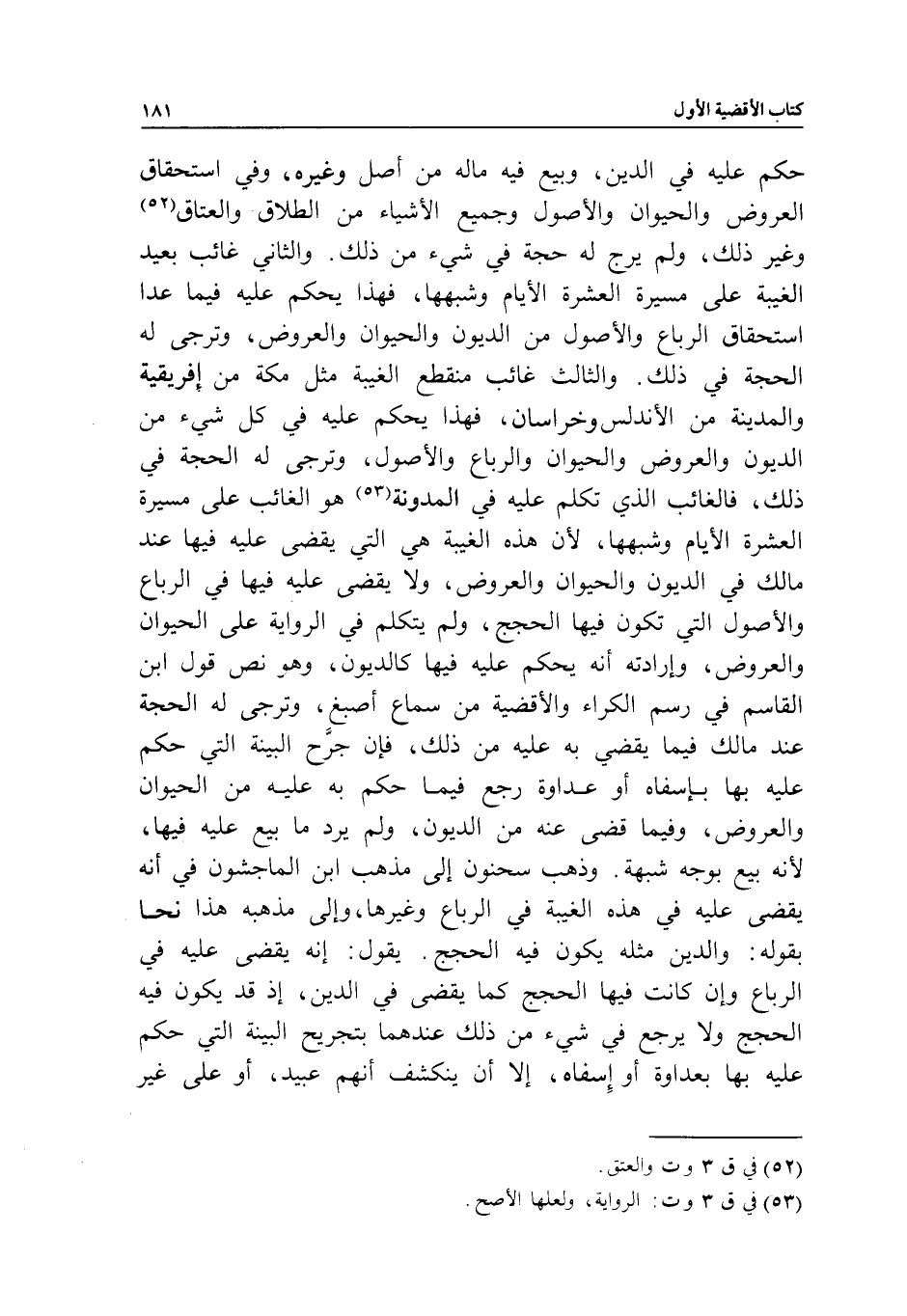 حكم عليه في الدين، وبيع فيه ماله من أصل وغيره، وفي استحقاق العروض والحيوان والأصول وجميع الأشياء من الطلاق والعتاق وغير ذلك، ولم يرج له حجة في شيء من ذلك. والثاني غائب بعيد الغيبة على مسيرة العشرة الأيام وشبهها، فهذا يحكم عليه فيما عدا استحقاق الرباع والأصول من الديون والحيوان والعروض، وترجى له الحجة في ذلك. والثالث غائب منقطع الغيبة مثل مكة من إفريقية والمدينة من الأندلس وخراسان، فهذا يحكم عليه في كل شيء من الديون والعروض والحيوان والرباع والأصول، وترجى له الحجة في ذلك، فالغائب الذي تكلم عليه في المدونة هو الغائب على مسيرة العشرة الأيام وشبهها؛ لأن هذه الغيبة هي التي يقضى عليه فيها عند مالك في الديون والحيوان والعروض، ولا يقضى عليه فيها في الرباع والأصول التي تكون فيها الحجج، ولم يتكلم في الرواية على الحيوان والعروض، وإرادته أنه يحكم عليه فيها كالديون، وهو نص قول ابن القاسم في رسم الكراء والأقضية من سماع أصبغ، وترجى له الحجة عند مالك فيما يقضي به عليه من ذلك، فإن جرح البينة التي حكم عليه بها بإسفاه أو عداوة رجع فيما حكم به عليه من الحيوان والعروض، وفيما قضى عنه من الديون، ولم يرد ما بيع عليه فيها؛ لأنه بيع بوجه شبهة. وذهب سحنون إلى مذهب ابن الماجشون في أنه يقضى عليه في هذه الغيبة في الرباع وغيرها، وإلى مذهبه هذا نحا بقوله: والدين مثله يكون فيه الحجج. يقول: إنه يقضى عليه في الرباع وإن كانت فيها الحجج كما يقضى في الدين، إذ قد يكون فيه الحجج ولا يرجع في شيء من ذلك عندهما بتجريح البينة التي حكم عليه بها بعداوة أو إسفاه، إلا أن ينكشف أنهم عبيد، أو على غير