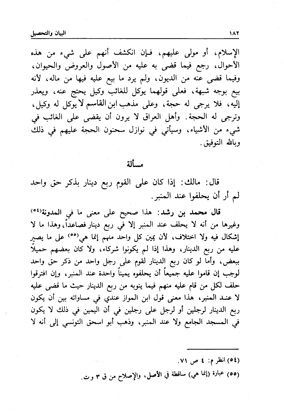 الإسلام، أو مولى عليهم، فإن انكشف أنهم على شيء من هذه الأحوال، رجع فيما قضى به عليه من الأصول والعروض والحيوان، وفيما قضى عنه من الديون، ولم يرد ما بيع عليه فيها من ماله؛ لأنه بيع بوجه شبهة، فعلى قولهما يوكل للغائب وكيل يحتج عنه، ويعذر إليه، فلا يرجى له حجة، وعلى مذهب ابن القاسم لا يوكل له وكيل، وترجى له الحجة. وأهل العراق لا يرون أن يقضى على الغائب في شيء من الأشياء، وسيأتي في نوازل سحنون الحجة عليهم في ذلك وبالله التوفيق.