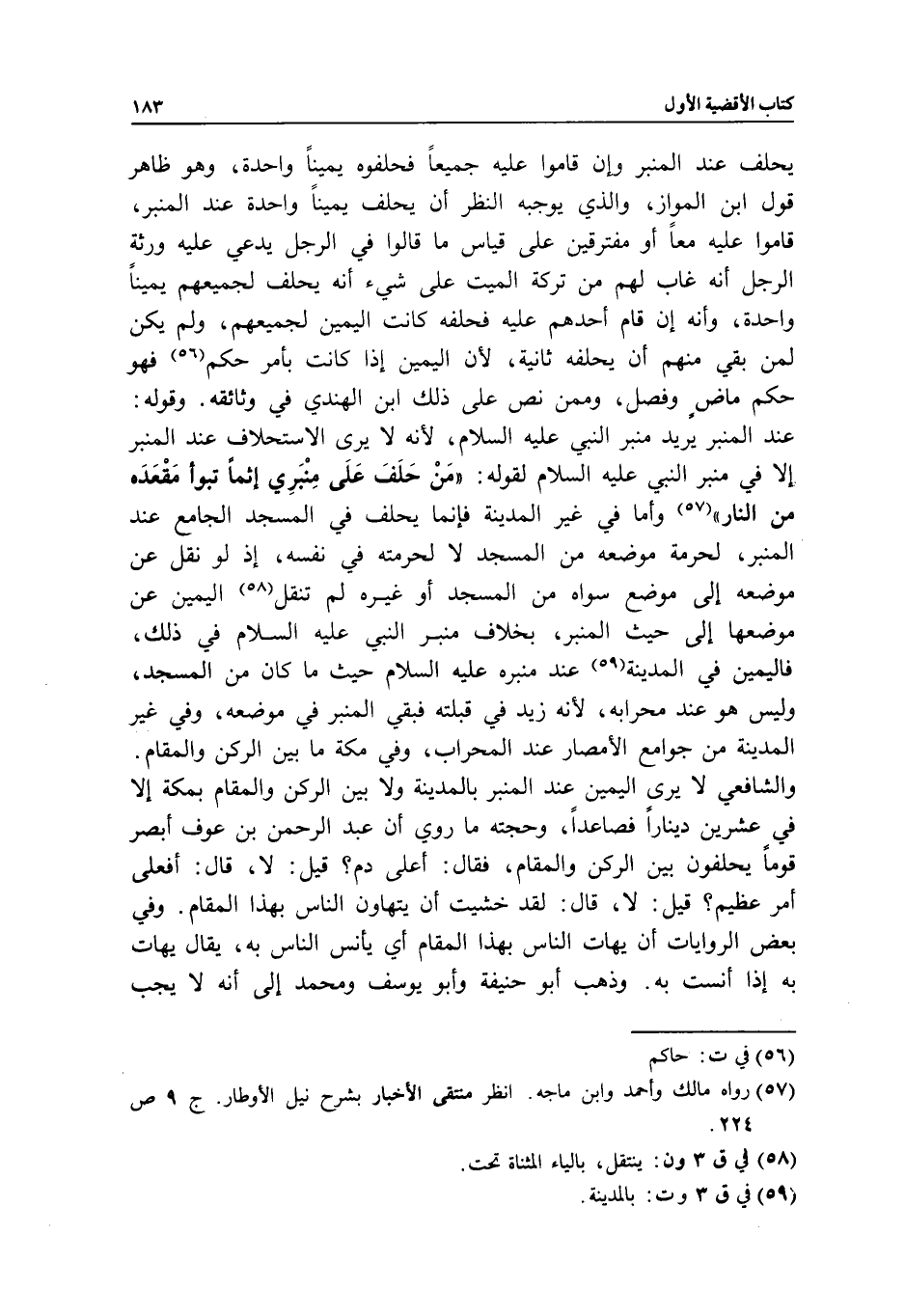 يحلف عند المنبر وإن قاموا عليه جميعا فحلفوه يمينا واحدة، وهو ظاهر قول ابن المواز، والذي يوجبه النظر أن يحلف يمينا واحدة عند المنبر، قاموا عليه معا أو مفترقين على قياس ما قالوا في الرجل يدعي عليه ورثة الرجل أنه غاب لهم من تركة الميت على شيء أنه يحلف لجميعهم يمينا واحدة، وأنه إن قام أحدهم عليه فحلفه كانت اليمين لجميعهم، ولم يكن لمن بقي منهم أن يحلفه ثانية؛ لأن اليمين إذا كانت بأمر حكم فهو حكم ماض وفصل، وممن نص على ذلك ابن الهندي في وثائقه. وقوله: عند المنبر يريد منبر النبي - عَلَيْهِ السَّلَامُ -؛ لأنه لا يرى الاستحلاف عند المنبر إلا في منبر النبي - عَلَيْهِ السَّلَامُ - لقوله: «من حلف على منبري إثما تبوأ مقعده من النار» وأما في غير المدينة فإنما يحلف في المسجد الجامع عند المنبر، لحرمة موضعه من المسجد لا لحرمته في نفسه، إذ لو نقل عن موضعه إلى موضع سواه من المسجد أو غيره لم تنقل اليمين عن موضعها إلى حيث المنبر، بخلاف منبر النبي - عَلَيْهِ السَّلَامُ - في ذلك، فاليمين في المدينة عند منبره - عَلَيْهِ السَّلَامُ - حيث ما كان من المسجد، وليس هو عند محرابه؛ لأنه زيد في قبلته فبقي المنبر في موضعه، وفي غير المدينة من جوامع الأمصار عند المحراب، وفي مكة ما بين الركن والمقام. والشافعي لا يرى اليمين عند المنبر بالمدينة ولا بين الركن والمقام بمكة إلا في عشرين دينارا فصاعدا، وحجته ما روي أن عبد الرحمن بن عوف أبصر قوما يحلفون بين الركن والمقام، فقال: أعلى دم؟ قيل: لا، قال: أفعلى أمر عظيم؟ قيل: لا، قال: لقد خشيت أن يتهاون الناس بهذا المقام. وفي بعض الروايات أن يهات الناس بهذا المقام أي يأنس الناس به، يقال يهات به إذا أنست به. وذهب أبو حنيفة وأبو يوسف ومحمد إلى أنه لا يجب
