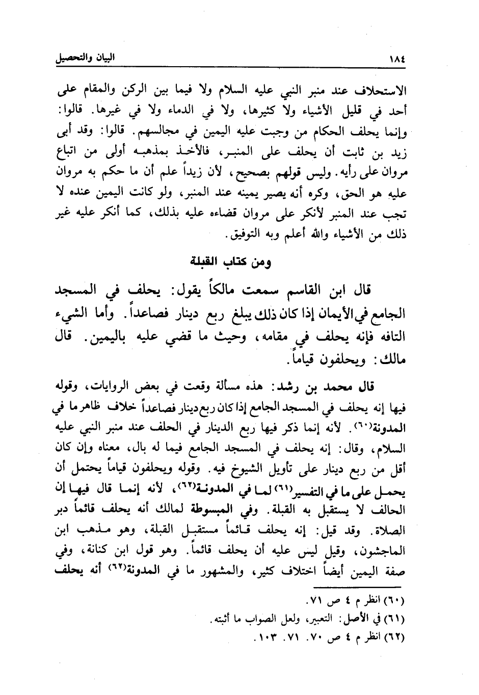 قال ابن القاسم: سمعت مالكا يقول: يحلف في المسجد الجامع في الأيمان إذا كان ذلك يبلغ ربع دينار فصاعدا. وأما الشيء التافه فإنه يحلف في مقامه، وحيث ما قضي عليه باليمين. قال مالك: ويحلفون قياما. قال محمد بن رشد: هذه مسألة وقعت في بعض الروايات، وقوله فيها: إنه يحلف في المسجد الجامع إذا كان ربع دينار فصاعدا خلاف ظاهر ما في المدونة. لأنه إنما ذكر فيها ربع الدينار في الحلف عند منبر النبي - عَلَيْهِ السَّلَامُ -، وقال: إنه يحلف في المسجد الجامع فيما له بال، معناه وإن كان أقل من ربع دينار على تأويل الشيوخ فيه. وقوله: ويحلفون قياما يحتمل أن يحمل على مما في التفسير لما في المدونة؛ لأنه إنما قال فيها: إن الحالف لا يستقبل به القبلة. وفي المبسوطة لمالك أنه يحلف قائما دبر الصلاة. وقد قيل: إنه يحلف قائما مستقبل القبلة، وهو مذهب ابن الماجشون، وقيل: ليس عليه أن يحلف قائما. وهو قول ابن كنانة، وفي صفة اليمين أيضا اختلاف كثير، والمشهور ما في المدونة أنه يحلف
