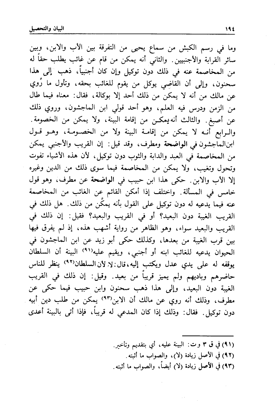 وما في رسم الكبش من سماع يحيى من التفرقة بين الأب والابن، وبين سائر القرابة والأجنبيين. والثاني أنه يمكن من قام عن غائب يطلب حقا له من المخاصمة عنه في ذلك دون توكيل وإن كان أجنبيا، ذهب إلى هذا سحنون، وإلى أن القاضي يوكل من يقوم للغائب بحقه، وتأول ما روي عن مالك من أنه لا يمكن من ذلك أحد إلا بوكالة، فقال: معناه فيما طال من الزمن ودرس فيه العلم، وهو أحد قولي ابن الماجشون، وروي ذلك عن أصبغ. والثالث أنه لا يمكن من إقامة البينة، ولا يمكن من الخصومة. والرابع أنه لا يمكن من إقامة البينة ولا من الخصومة، وهو قول ابن الماجشون في الواضحة ومطرف، وقد قيل: إن القريب والأجنبي يمكن من المخاصمة في العبد والدابة والثوب دون توكيل؛ لأن هذه الأشياء تفوت وتحول وتغيب، ولا يمكن من المخاصمة فيما سوى ذلك من الدين وغيره إلا الأب والابن. حكى هذا ابن حبيب في الواضحة عن مطرف، وهو قول خامس في المسألة. واختلف إذا أمكن القائم عن الغائب من المخاصمة عنه فيما يدعيه له دون توكيل على القول بأنه يمكن من ذلك. هل ذلك في القريب الغيبة دون البعيد؟ أو في القريب والبعيد؟ فقيل: إن ذلك في القريب والبعيد سواء، وهو الظاهر من رواية أشهب هذه، إذ لم يفرق فيها بين قرب الغيبة من بعدها، وكذلك حكى أبو زيد عن ابن الماجشون في الحيوان يدعيه للغائب ابنه أو أجنبي، ويقيم عليه البينة أن السلطان يوقفه له على يدي عدل ويكتب إليه، قال: لا لأن السلطان ينظر للناس حاضرهم وباديهم ولم يميز قريبا من بعيد. وقيل: إن ذلك في القريب الغيبة دون البعيد، وإلى هذا ذهب سحنون وابن حبيب فيما حكى عن مطرف، وذلك أنه روي عن مالك أن الابن يمكن من طلب دين أبيه دون توكيل. فقال: وذلك إذا كان المدعي له قريبا، فإذا أتى بالبينة أعدى