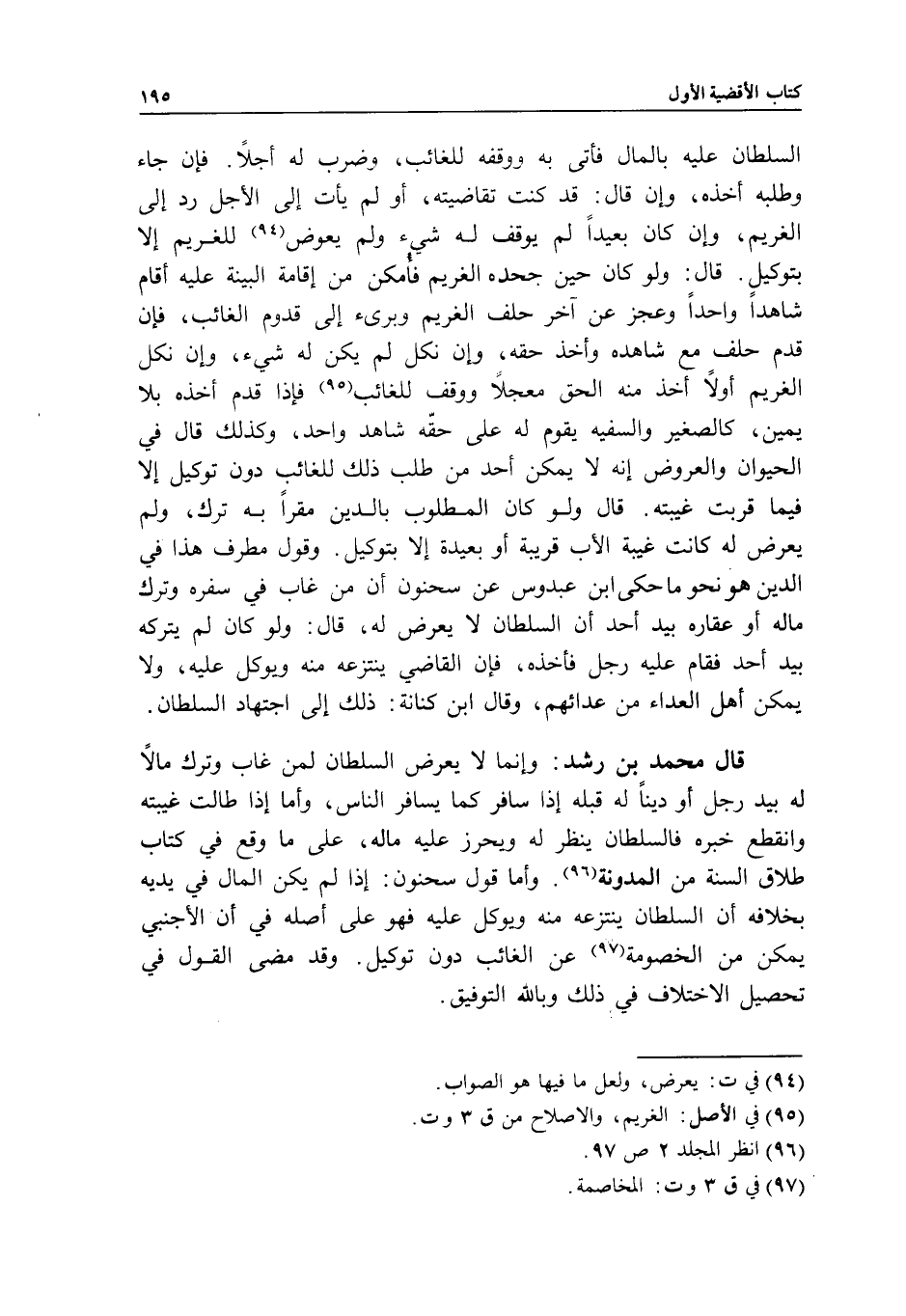 السلطان عليه بالمال فأتى به ووقفه للغائب، وضرب له أجلا. فإن جاء وطلبه أخذه، وإن قال: قد كنت تقاضيه، أو لم يأت إلى الأجل رد إلى الغريم، وإن كان بعيدا لم يوقف له شيء ولم يعوض للغريم إلا بتوكيل. قال: ولو كان حين جحده الغريم فأمكن من إقامة البينة عليه أقام شاهدا واحدا وعجز عن آخر حلف الغريم وبرئ إلى قدوم الغائب، فإن قدم حلف مع شاهده وأخذ حقه، وإن نكل لم يكن له شيء، وإن نكل الغريم أولا أخذ منه الحق معجلا ووقف للغائب فإذا قدم أخذه بلا يمين، كالصغير والسفيه يقوم له على حقه شاهد واحد، وكذلك قال في الحيوان والعروض إنه لا يمكن أحد من طلب ذلك للغائب دون توكيل إلا فيما قربت غيبته. قال: ولو كان المطلوب بالدين مقرا به ترك، ولم يعرض له كانت غيبة الأب قريبة أو بعيدة إلا بتوكيل. وقول مطرف هذا في الدين هو نحو ما حكى ابن عبدوس عن سحنون أن من غاب في سفره وترك ماله أو عقاره بيد أحد أن السلطان لا يعرض له، قال: ولو كان لم يتركه بيد أحد فقام عليه رجل فأخذه، فإن القاضي ينتزعه منه ويوكل عليه، ولا يمكن أهل العداء من عدائهم، وقال ابن كنانة: ذلك إلى اجتهاد السلطان.